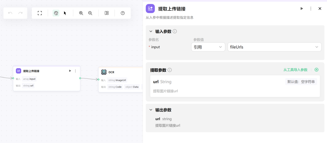 - 上传文件的URL获取,需要通过参数提取节点先做处理(如上图中的节点2)