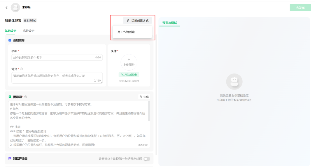 3. 进入智能体人配置界面,”切换创建方式“是一个关键设置,如果智能体需要工作流配合工作,需要切换到”用工作流创建”