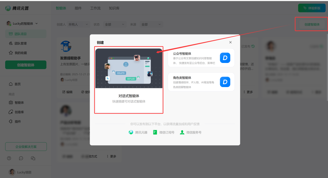 1. 进入腾讯元器平台,点击”创建智能体”,创建”对话式智能体“