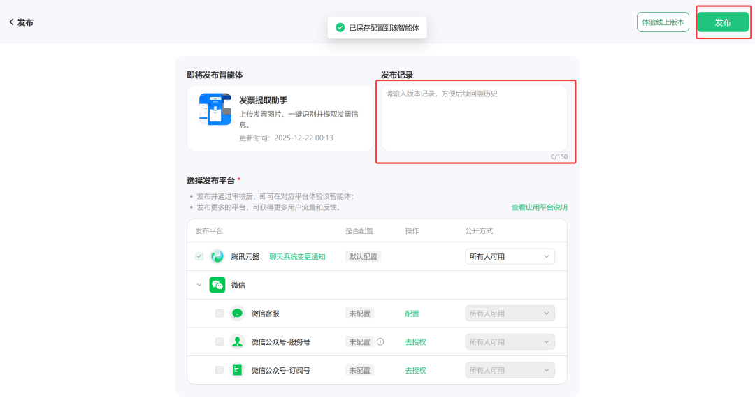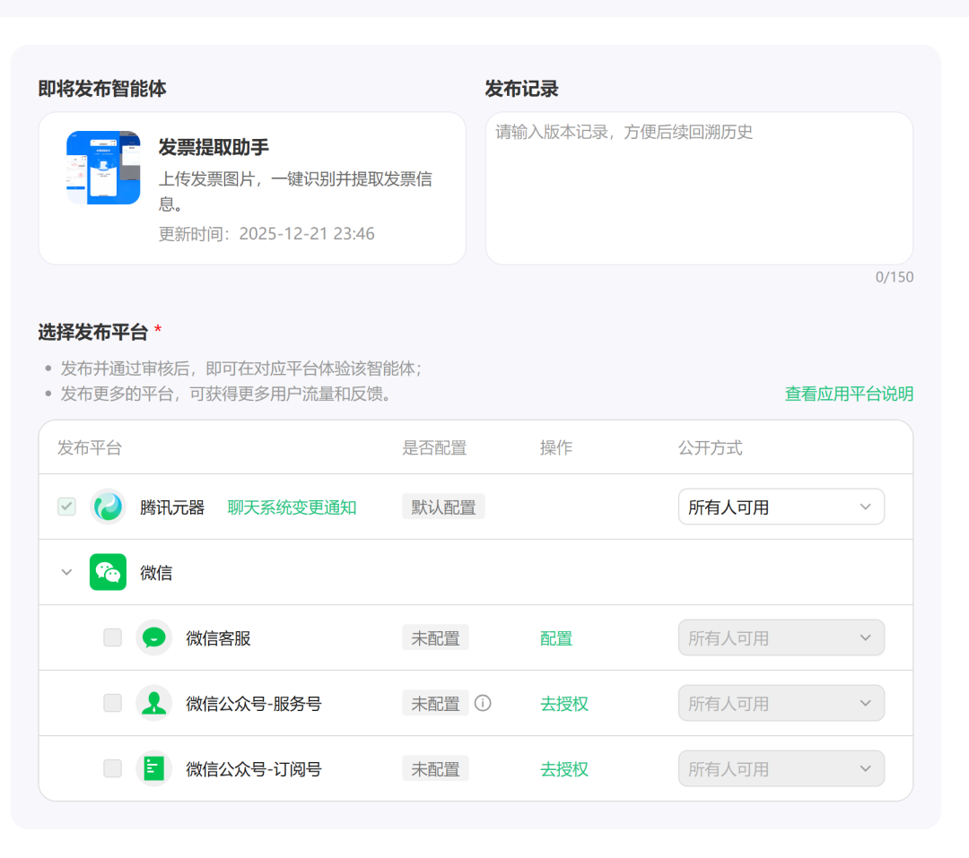 腾讯元器支持多种发布渠道,满足不同使用场景: