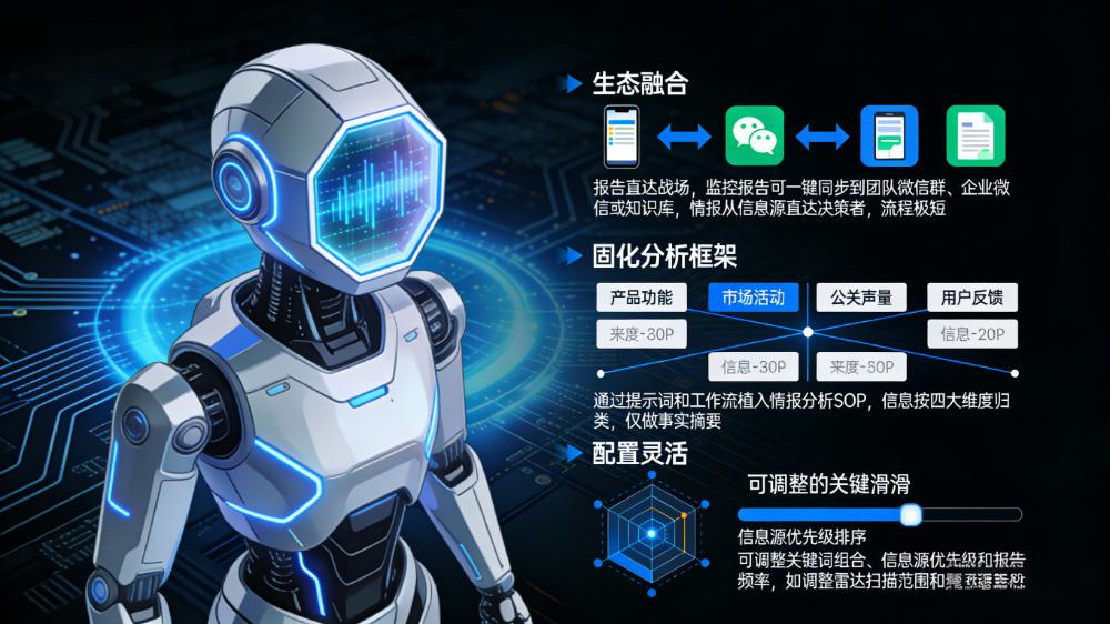 - 个性化情报推送: 根据团队中产品、市场、销售等不同角色的关注标签,从总报告中提取相关信息进行定向推送。