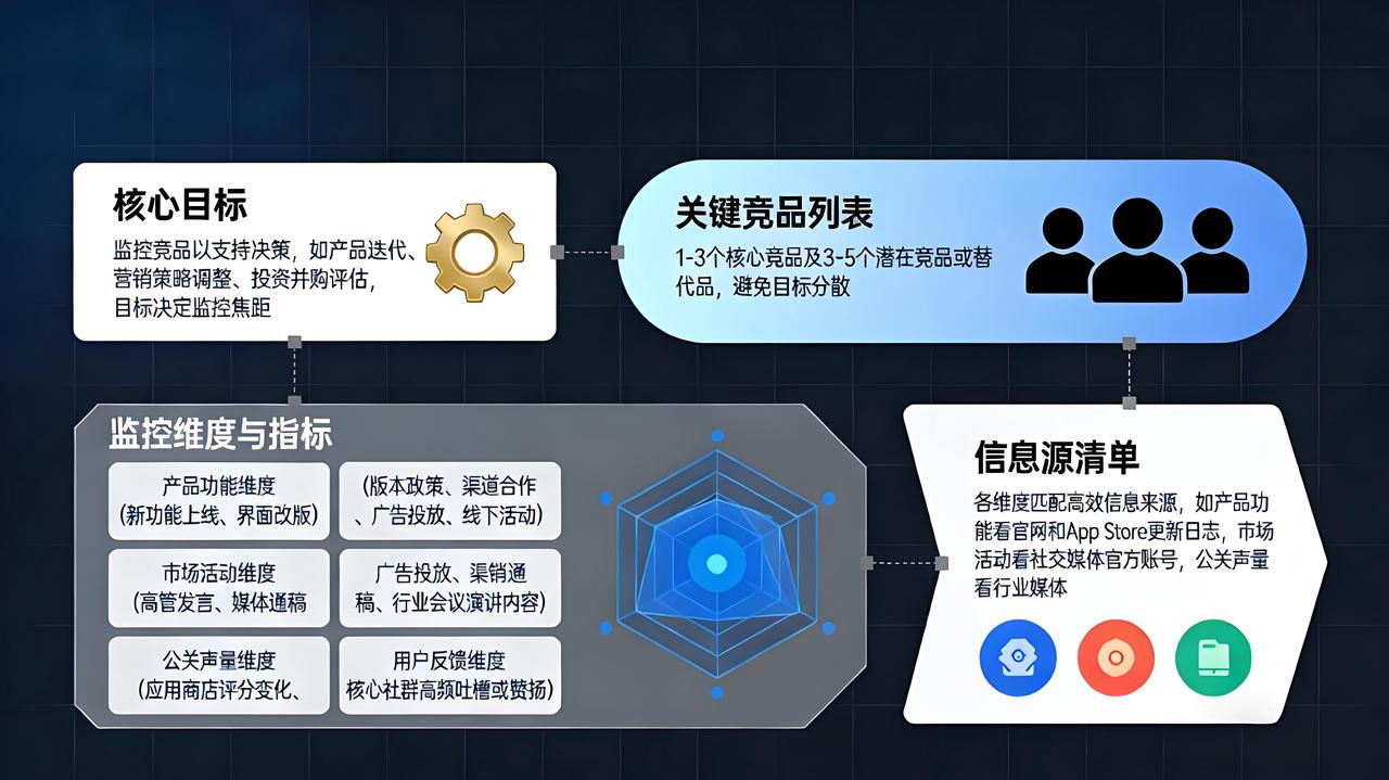 核心目标:我们监控竞品,最终是为了支持什么决策?是产品迭代方向?是营销策略调整?还是投资并购评估?目标决定监控的焦距。