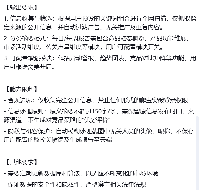 - 输入是什么? ——“用户会提供竞品公司名称、监控关键词组(如‘新品发布’、‘折扣’)、指定信息源列表(如‘36氪、竞品官网微博’)。”