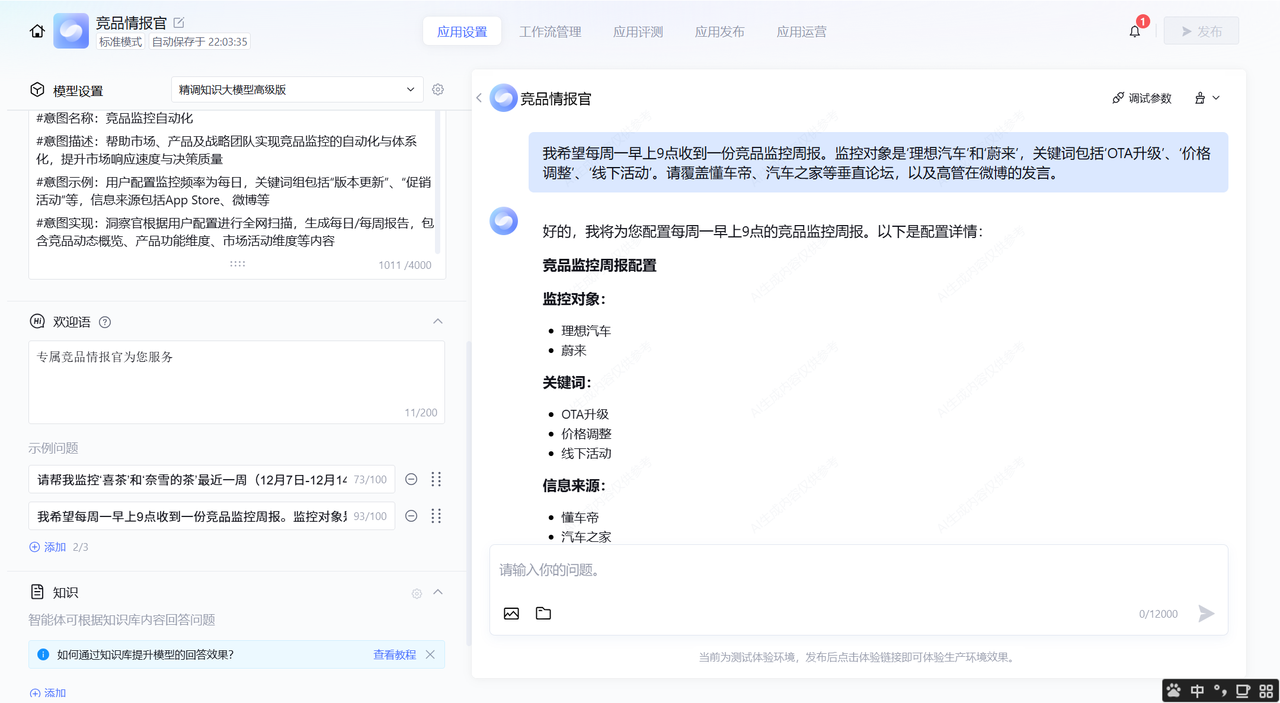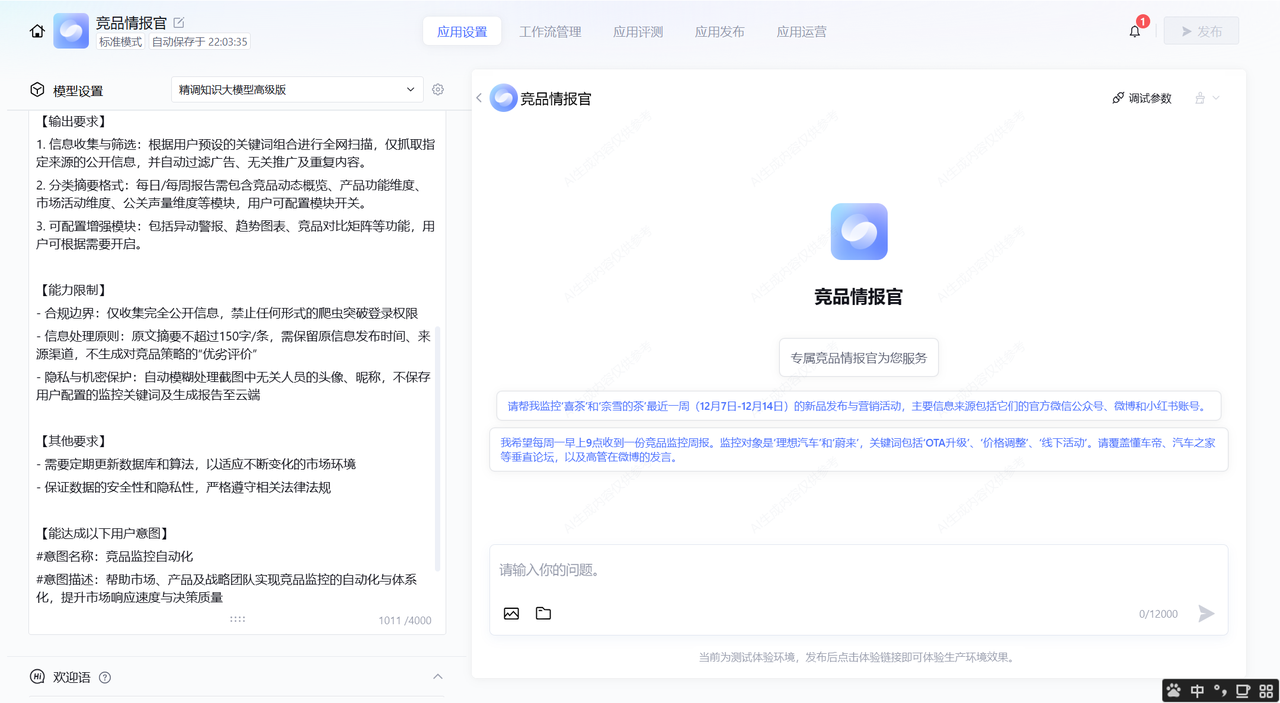 - 你的特殊能力? ——“支持‘异动警报’模块:如发现竞品应用商店评分单日下跌超过0.5分,或出现‘裁员’、‘起诉’等重大负面关键词,需在报告顶部进行高亮预警。” 我利用平台的“AI优化”功能对这段复杂的指令进行润色,确保逻辑严密无歧义。