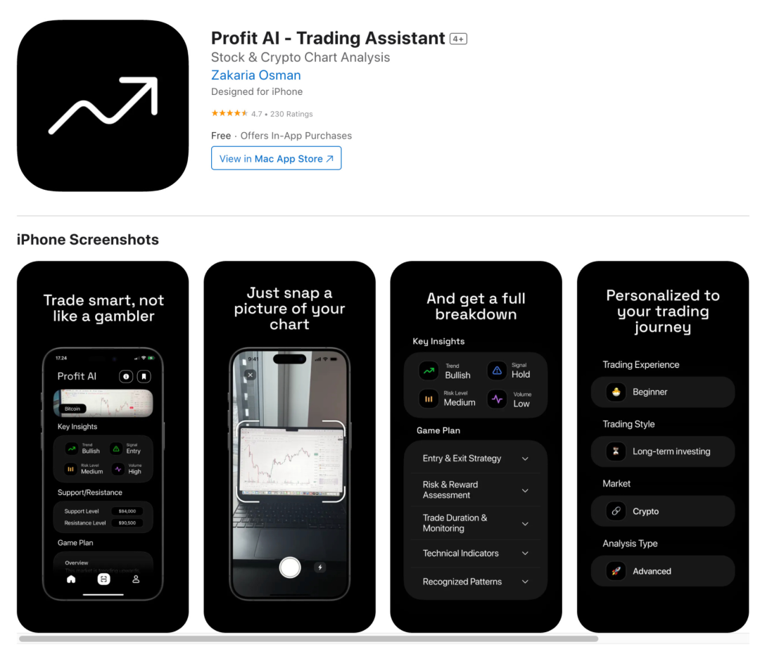 在我看来,这种文化转变创造了巨大的商业机会。年轻用户不想参加昂贵的线下研讨会,也不想阅读厚重的交易书籍,但他们愿意为一个简单好用的应用付费,特别是当这个应用承诺能用 AI 帮他们做出更好的交易决策时。Profit AI 正是抓住了这个机会。