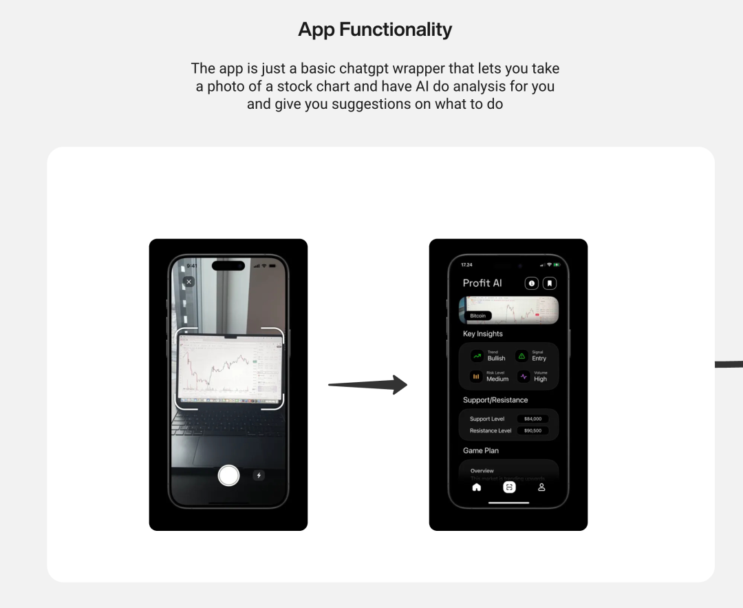 Sebastian 在分析中指出,Profit AI 的核心功能非常简单:用户上传一张股票图表的照片,AI 就会给出分析。他甚至直接展示了这个应用的全部技术:就是调用 ChatGPT API,上传图片,发送提示词,然后返回分析结果。如果你直接用 ChatGPT 做同样的事情,得到的信息几乎一模一样。这个应用唯一做的,就是把这个过程包装得更精美一些,界面更友好一些。