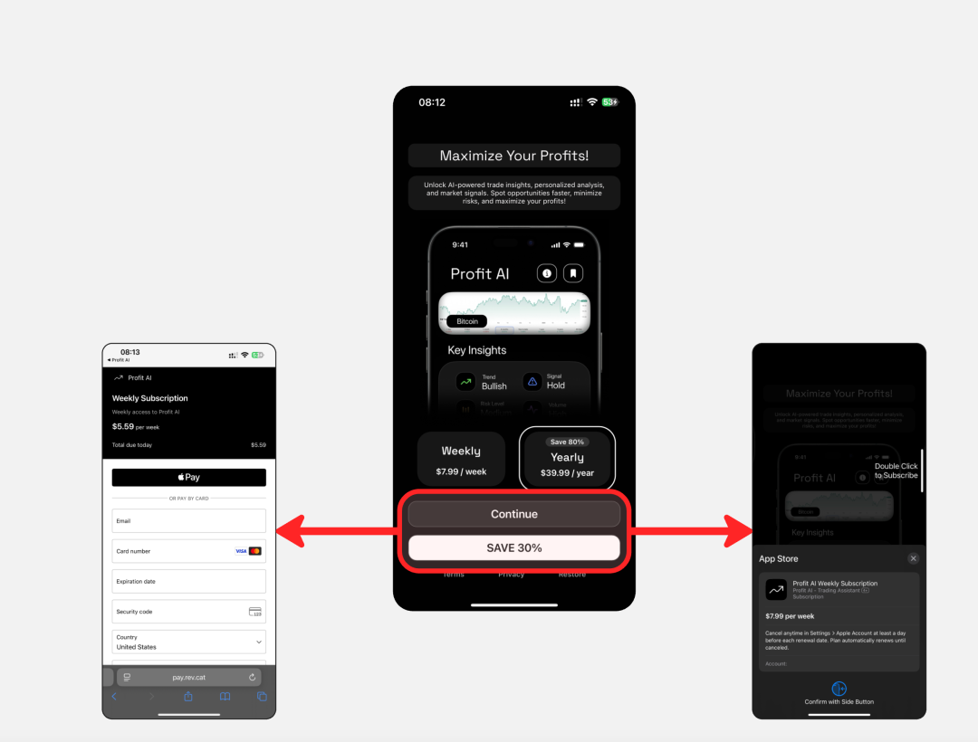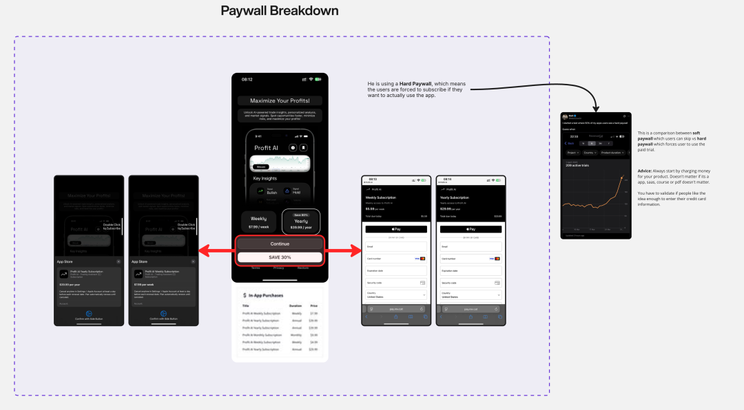 在付费模式上,Sebastian 指出 Profit AI 采用的是硬付费墙(hard paywall),不提供免费试用,用户必须付费才能使用。这个应用测试了几种不同的定价:周付费从4.99美元到7.99美元,年付费从2.99美元到3.99美元,月付费9.99美元。最终他们发现周付费和年付费效果最好,因为周付费产生更多经常性收入,年付费带来更多前期现金。