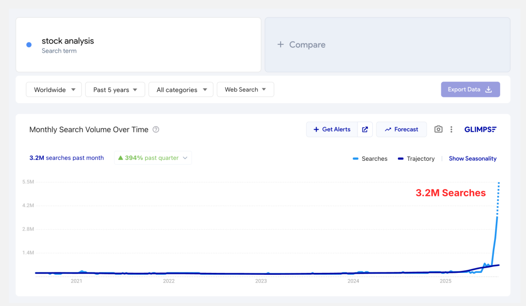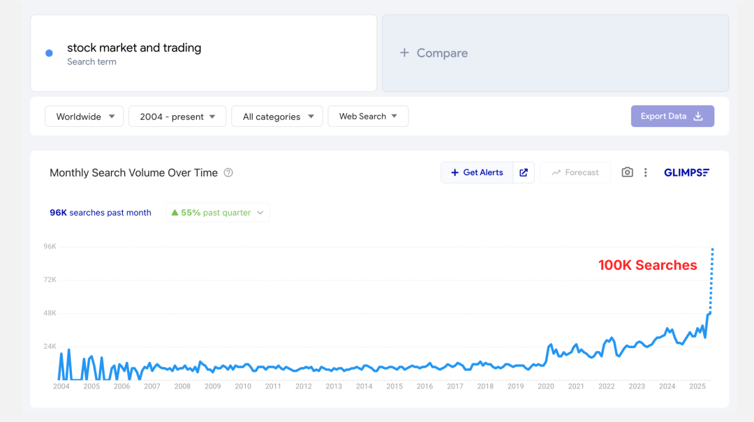 Sebastian 花了相当长的时间分析为什么金融交易市场特别适合这类应用。他指出,现在这个市场正处于历史最高点。通过 Google Trends 数据可以看到,所有与股票分析、日间交易、外汇、加密货币相关的搜索词都在暴涨,甚至超过了2021年 GameStop 和 AMC 事件期间的峰值。