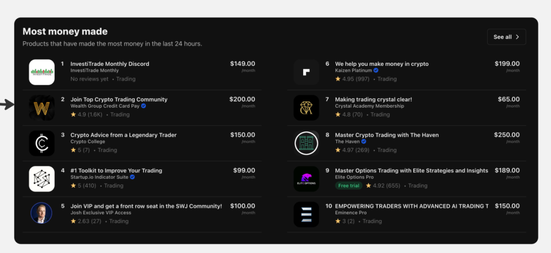 一旦建立了这种权威,就可以进入第三步:建立会员社群。在 Whop、School、Discord 或 Telegram 上建立社群,让那些相信 AI 会让他们变富的人聚在一起讨论如何通过 AI 变得更富,如何用 AI 制定策略等等。Sebastian 认为,现在交易会员社群可能是除了 OnlyFans 之外最畅销的在线会员类型。