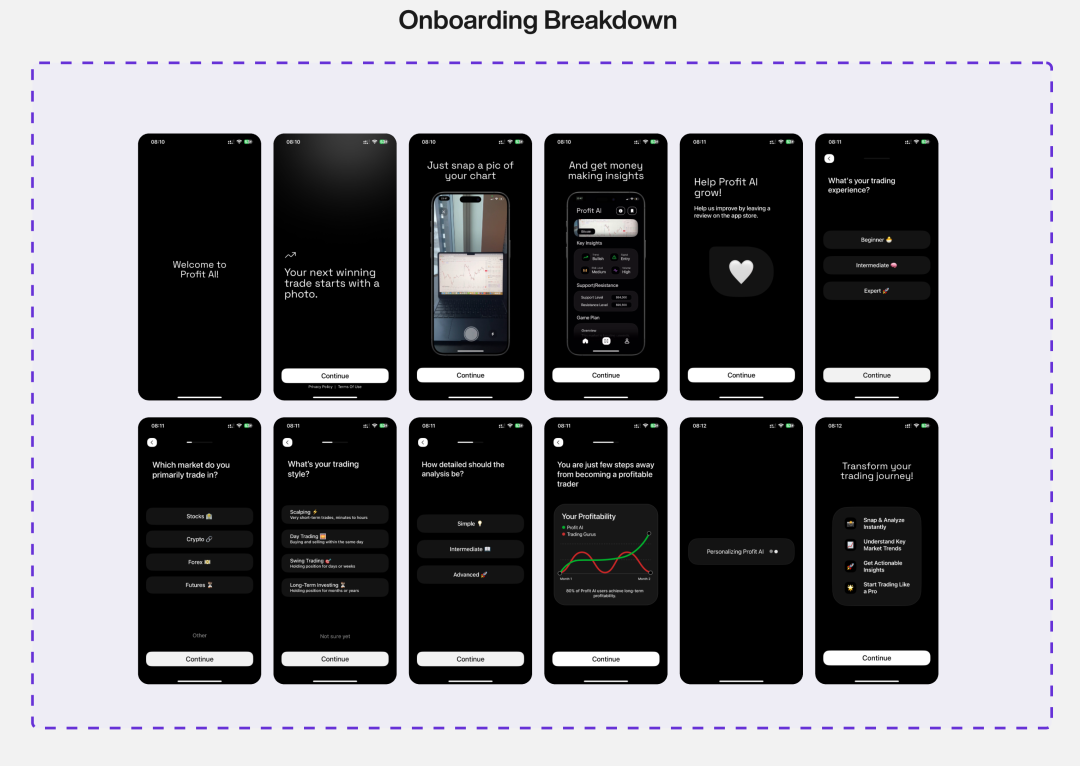 Sebastian 花了很多时间强调一点:Profit AI 这个应用本身其实非常非常简单。他详细拆解了应用的入门流程,指出它只有几个基本屏幕:欢迎页面、使用教程演示、请求评价、一个小测验来收集用户信息,然后就是付费墙。