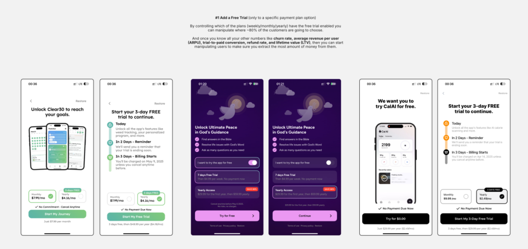 一旦你知道了流失率、每用户平均收入、试用转付费率、退款率、生命周期价值等所有数字,你就可以精确控制从每个用户身上榨取最多价值的方式。Sebastian 展示了几个案例。Clear 30 选择在年付费套餐上提供试用,因为他们想要前期现金流,这样就能更快地把钱投回广告。而 Bible Chat 则在月付费上提供7天试用,因为他们更关注生命周期价值,愿意在前期亏损来获客,然后在后期通过续费赚回来。