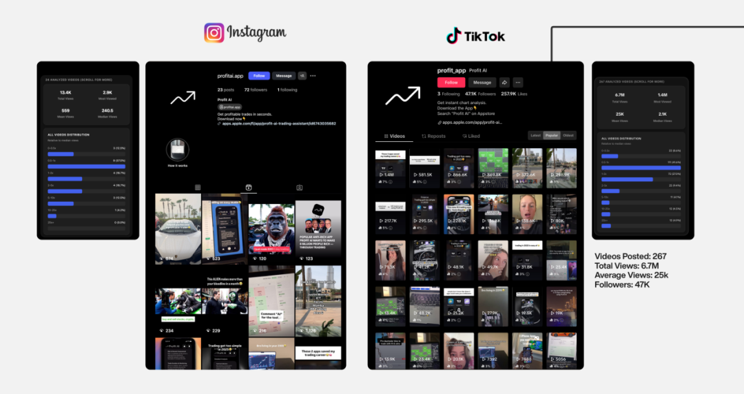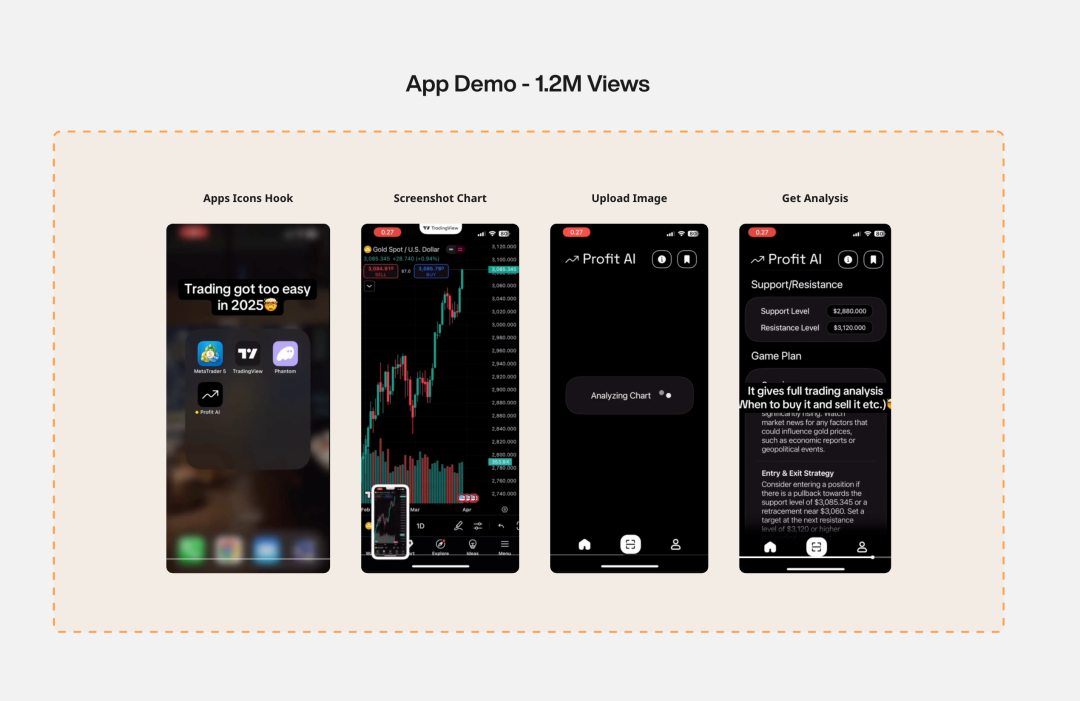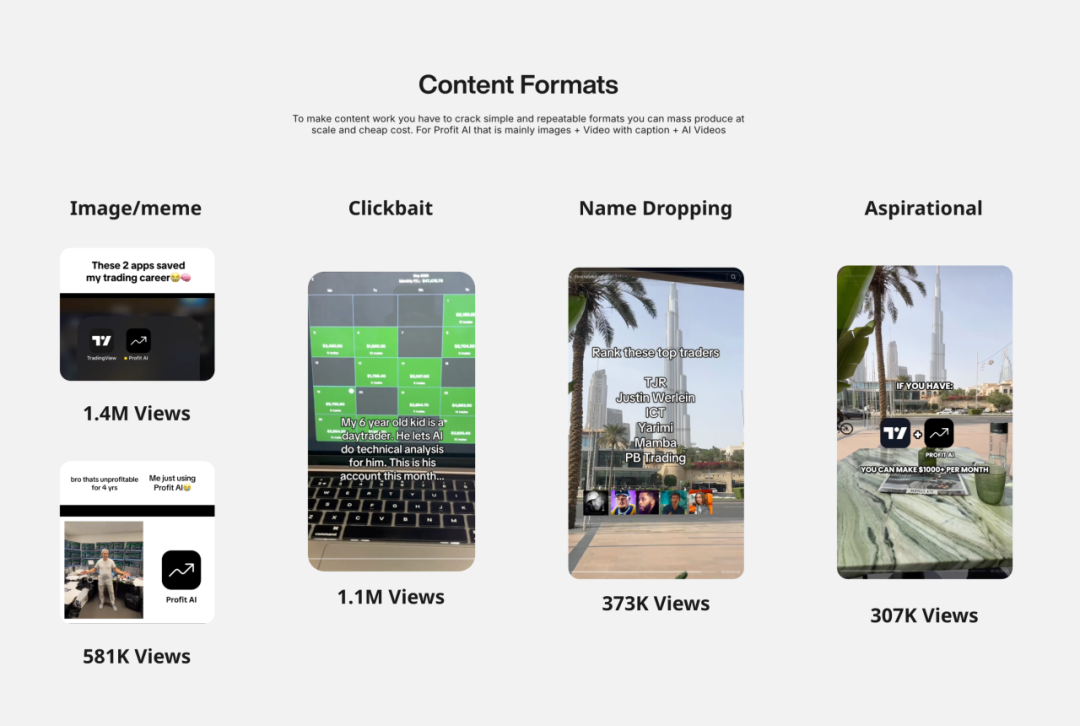 我仔细看了 Sebastian 分析的几种表现最好的内容格式。第一种是图片广告和表情包视频,真的就是一张图片配上音乐。比如”这两个交易应用拯救了我的职业生涯”,然后就是 Profit AI 和 Trading View 的截图,配上音乐。或者”我亏损了好几年,现在我用 Profit AI 盈利了”,配上一张图和流行音乐。140万次观看,50万次观看。就这么简单。