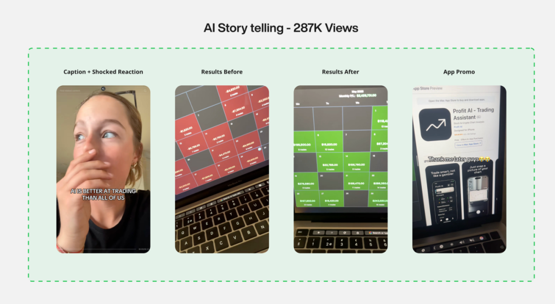 然后有两种稍微”高级”一点的内容。一种是应用演示,还是文字加搞笑音乐,然后演示应用如何工作:打开应用,截图一个图表,上传,获得分析,然后一个行动号召说”现在下载”。另一种是 AI 故事广告,就是一个文字配上 AI 生成的震惊女孩说”AI 太疯狂了”,然后展示使用前后的结果对比,最后是应用演示。