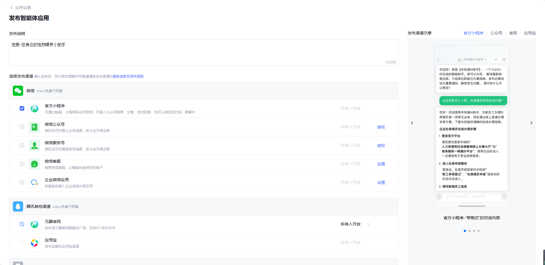 作为腾讯系的产品,使用元器搭建智能体,可以一键对接公众号和小程序。无需下载APP或培养新的使用习惯,在微信里就可以直接询问,让“宠爱”化身为24小时在线的贴心小助手。