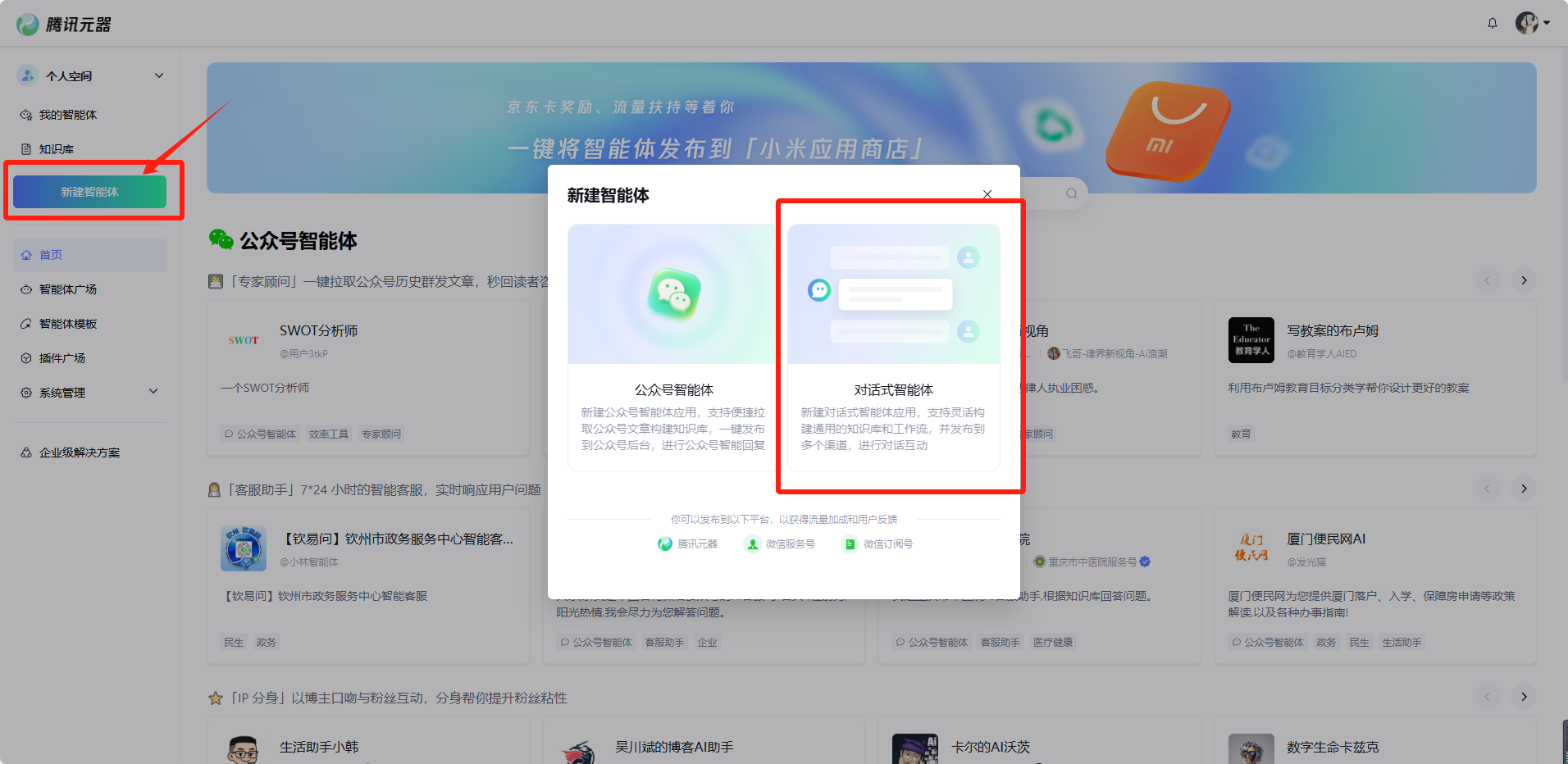 打开腾讯元器官网(网址:首页 – 腾讯元器),用微信扫码登录,然后选择【新建智能体】。这里可以看到有2种选择,“公众号智能体”可以一键拉取公众号文章作为知识库,智能体搭建成功后,可以集成到公众号内,进行公众号智能回复;“对话式智能体”可以灵活构建知识库和工作流,并发布到多个渠道进行使用。