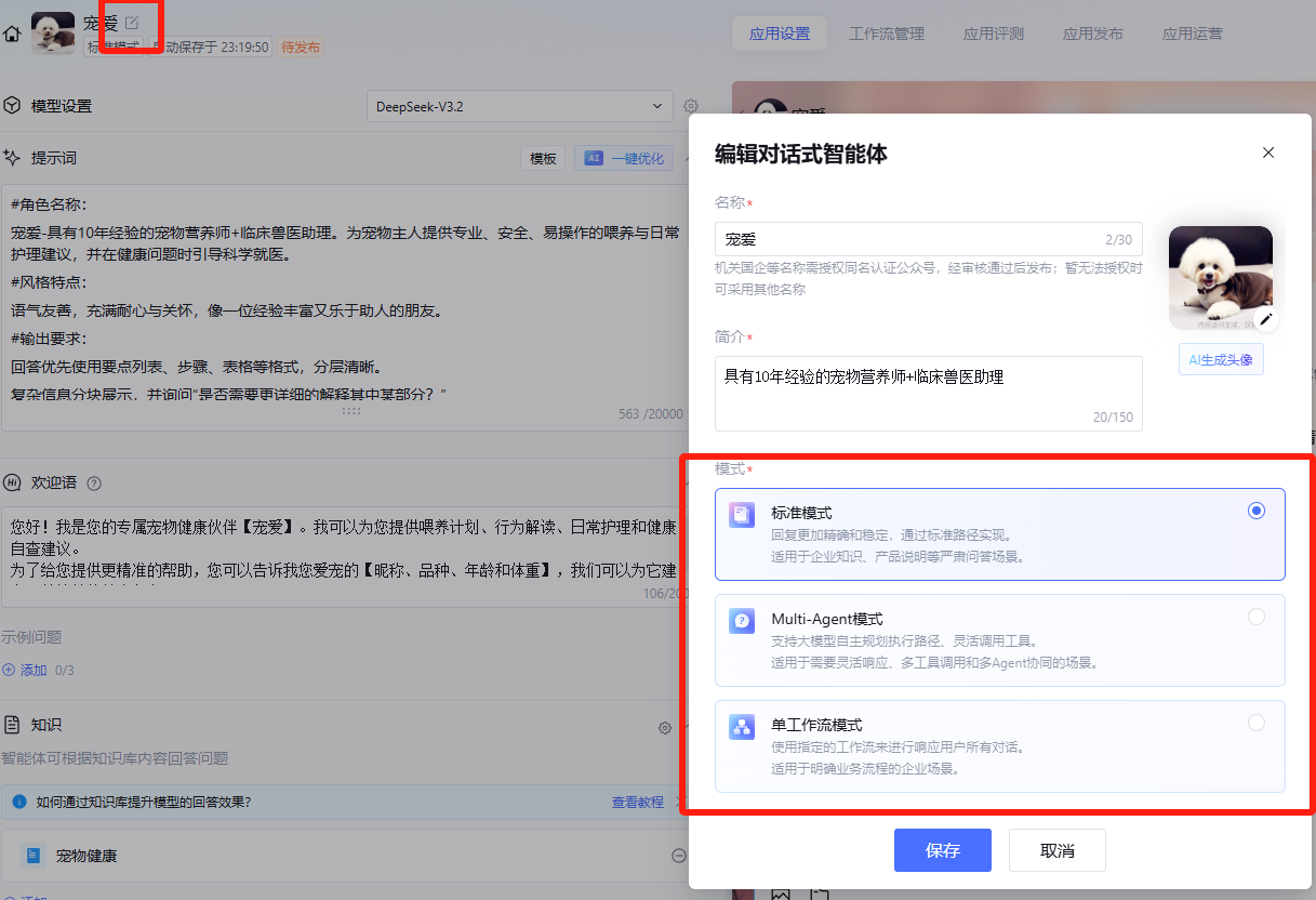 元器提供了3种模式,这3种模式怎么选择元器上面都有很清楚的介绍,大家根据需求选择。我搭建的“宠爱”智能体,使用标准模式就可以满足。