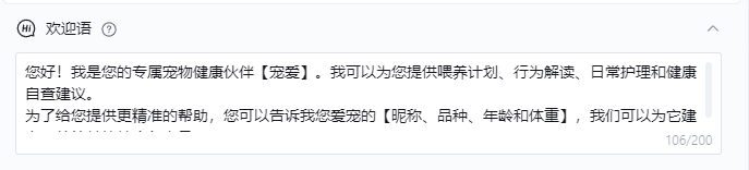欢迎语是用户对于“宠爱”智能体的第一印象,能快速的让用户知道“宠爱”是干什么的。这里我明确了“宠爱”的定位,并引导用户的提问方式。