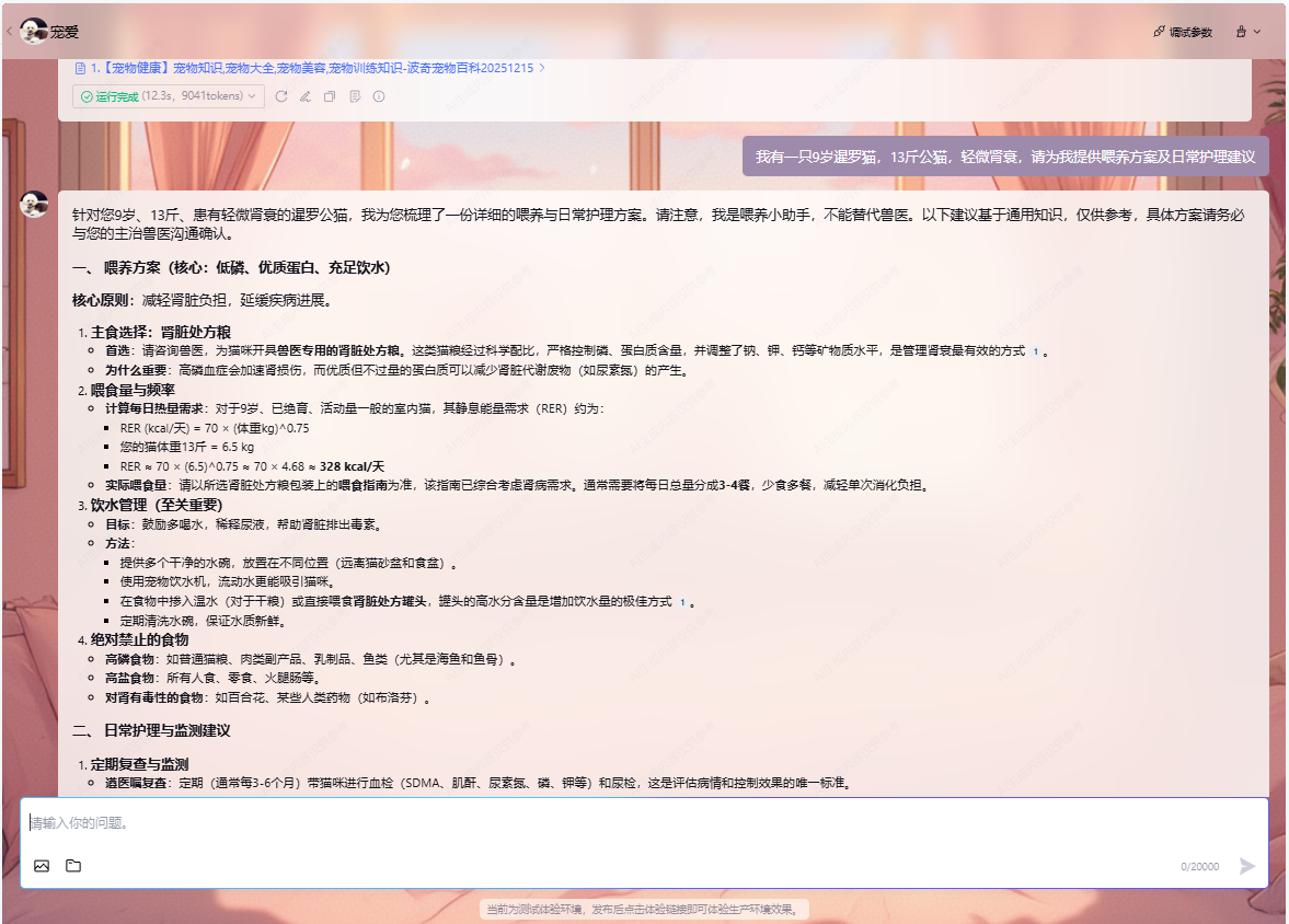 原因很简单:“宠爱”可以为宠物主人提供伴随式、可信赖、个性化的养护支持。通用AI可以告诉我,一只13斤的公猫,一天应该喂多少粮;但是它无法告诉我,一只13斤的已经绝育且有点肾衰的公猫,一天应该喂多少粮,饮食应该注意什么。我需要的是,结合我的宠物的具体情况,为我定制化的喂养方案,而元器智能体,恰好能满足我的需求。