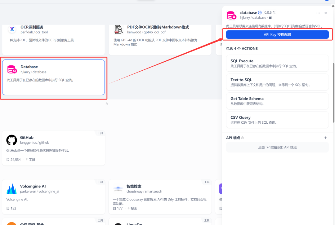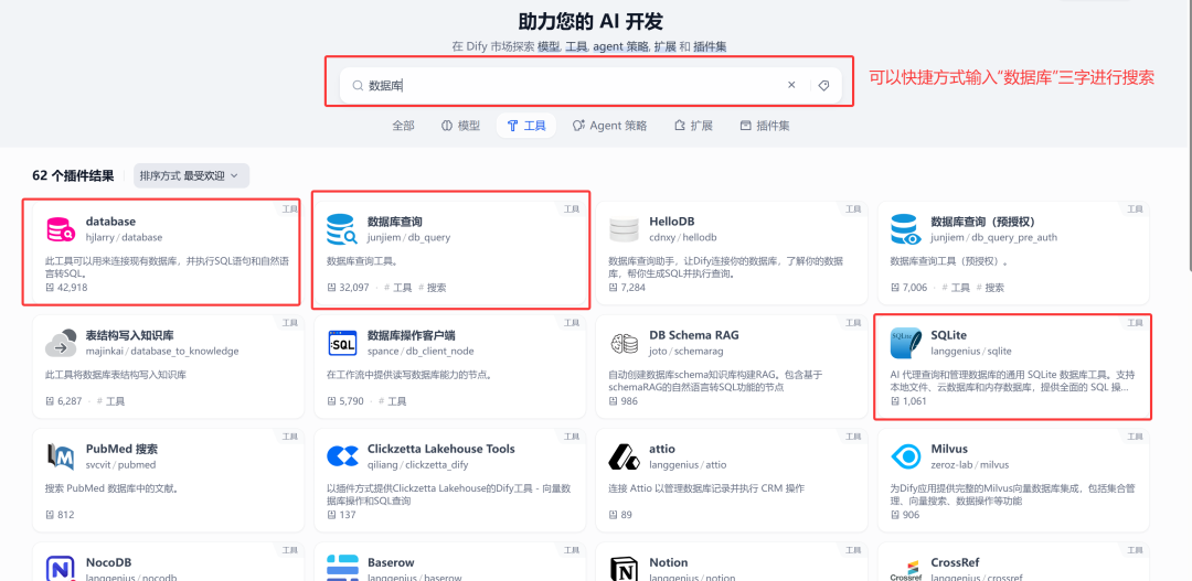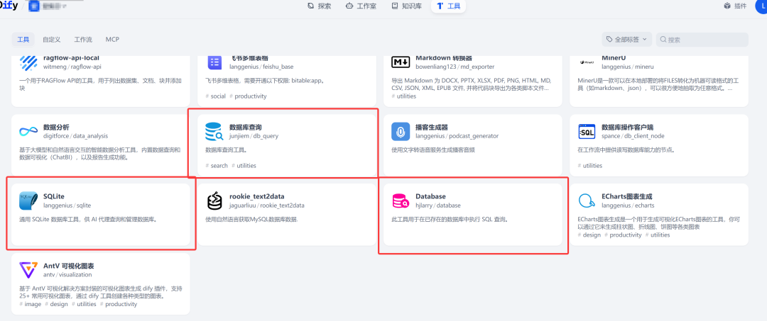 插件工具接入:使用Dify提供的数据库相关插件工具,包括SQL查询、Database工具和SQLite工具