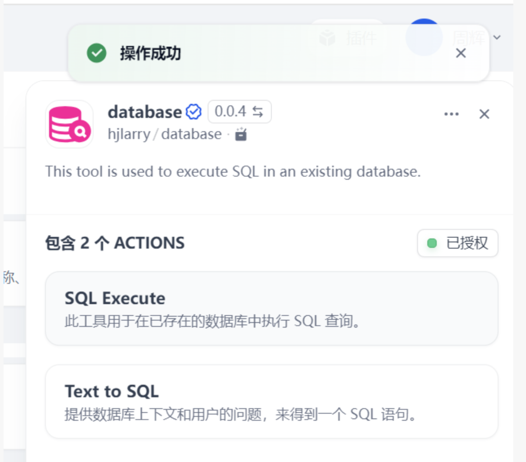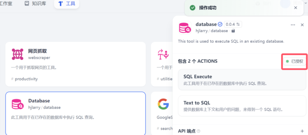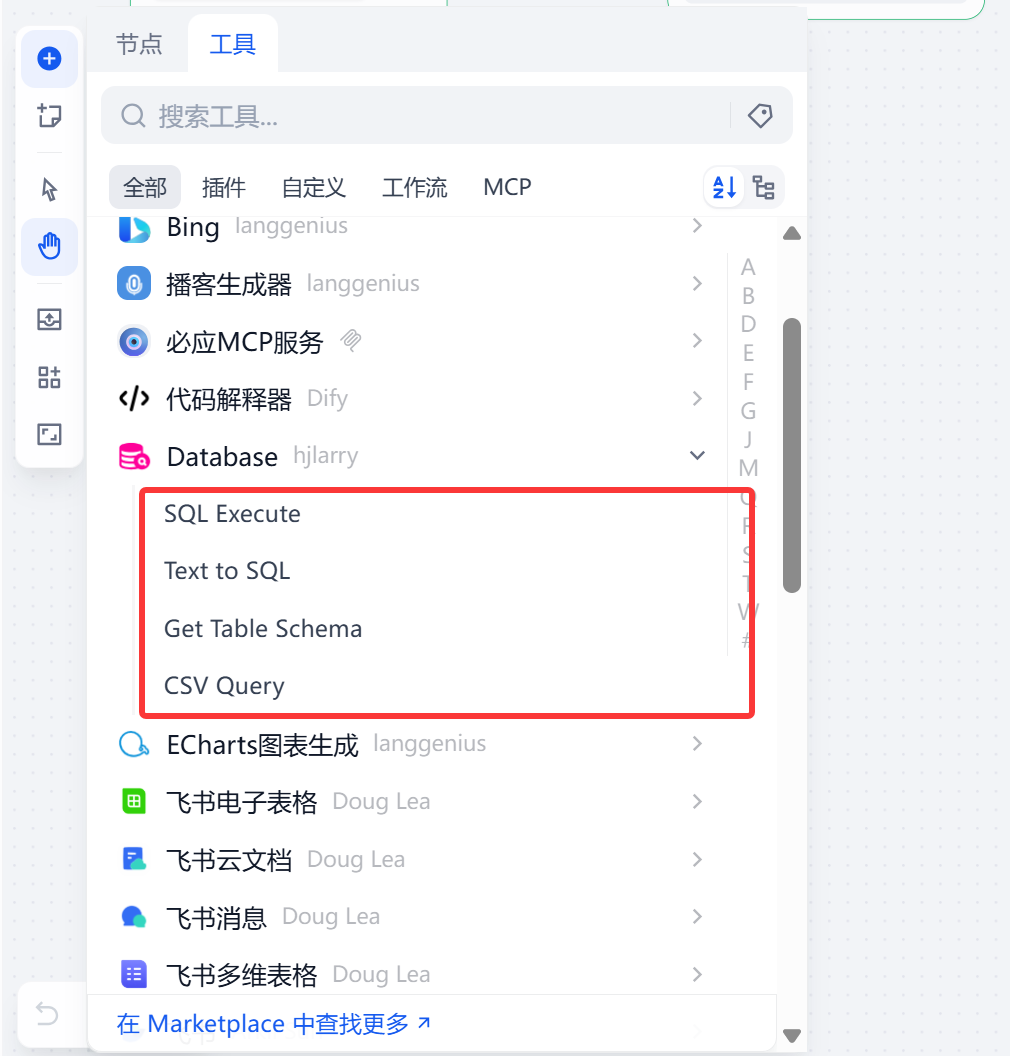 - Database工具:连接现有数据库,执行SQL语句和自然语言转SQL