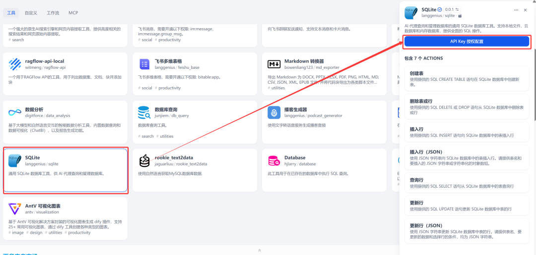 6. SQLite工具授权问题问题描述:SQLite工具安装后无法配置数据库连接或执行操作解决方案:确保已完成API Key授权配置检查授权状态是否显示为”已授权”如果授权失败,检查API Key是否正确重新进行授权配置授权完成后才能配置数据库连接参数和执行操作