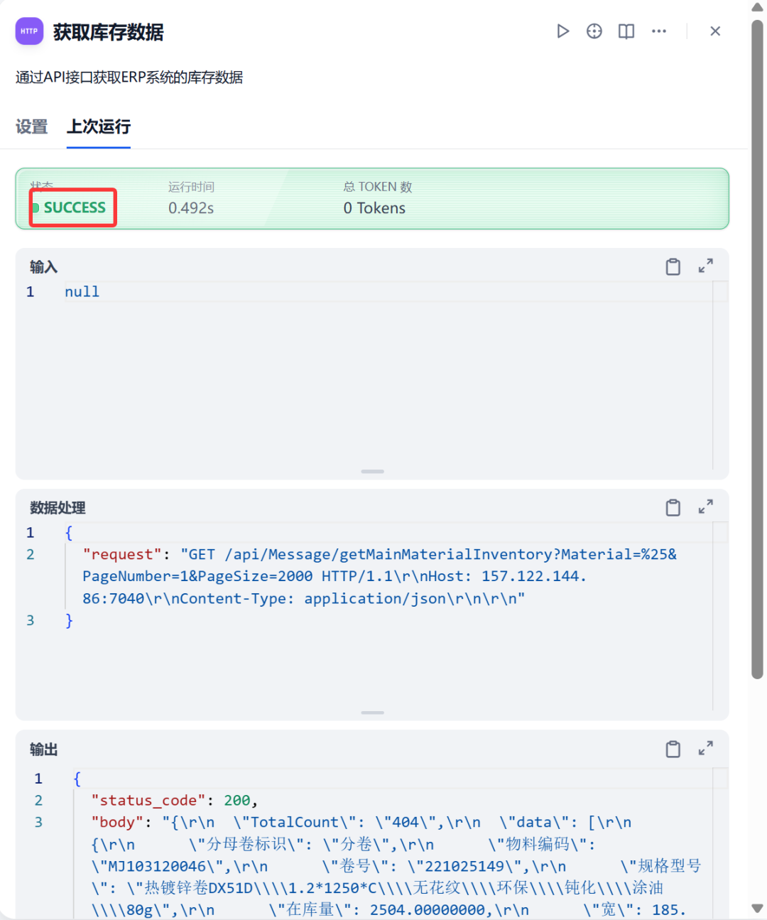 下面例子为我在某项目中的其中一个例子,Get的请求方式获取ERP系统中的库存数据: