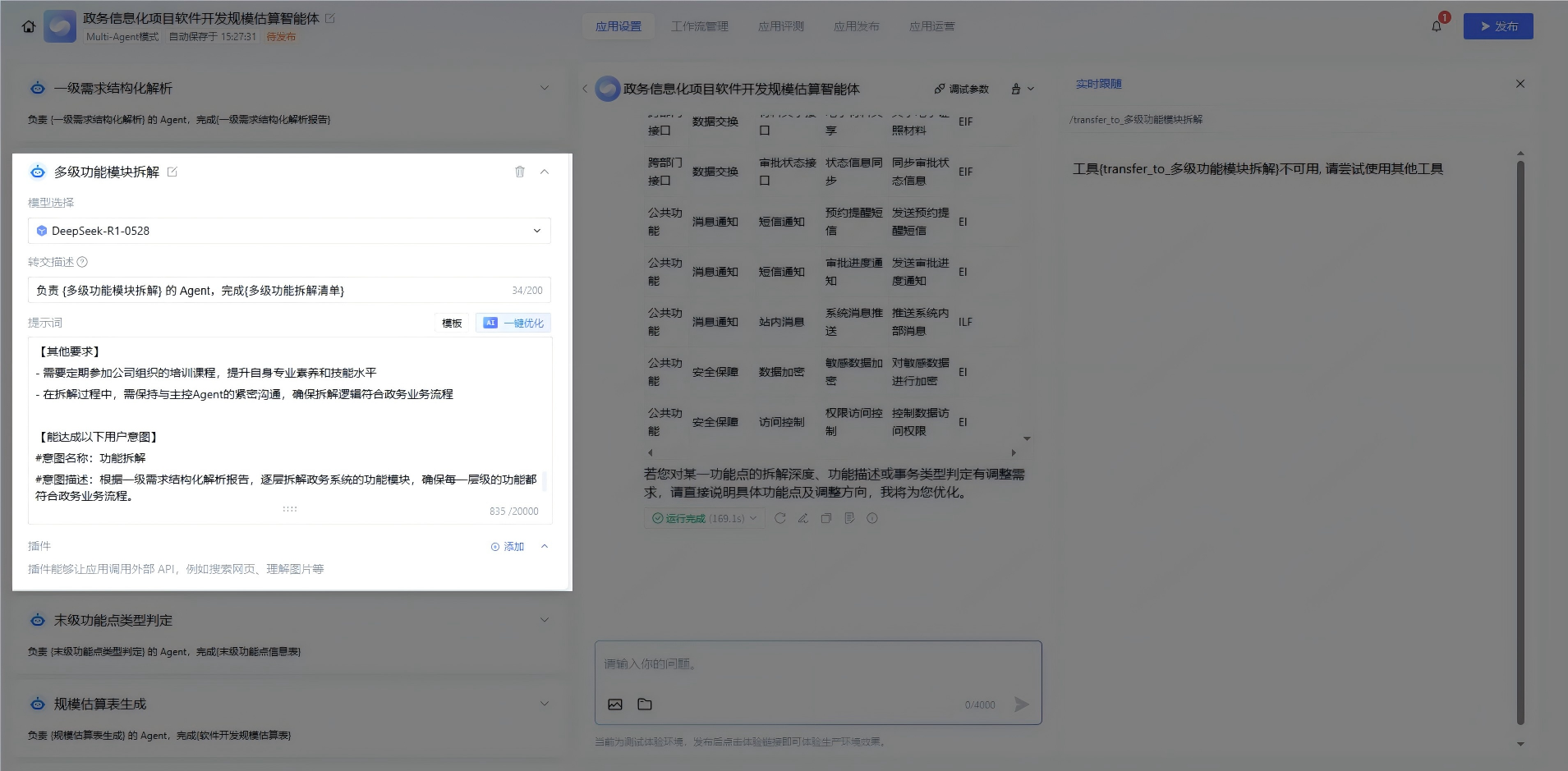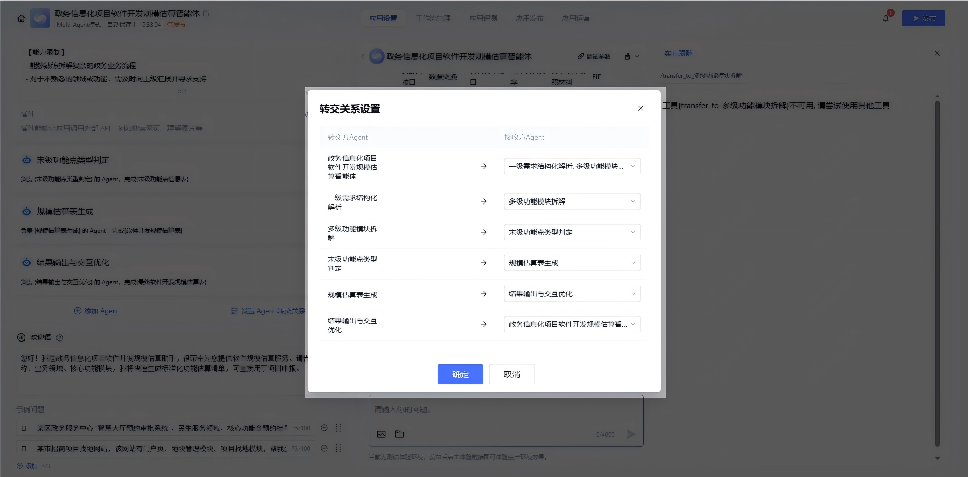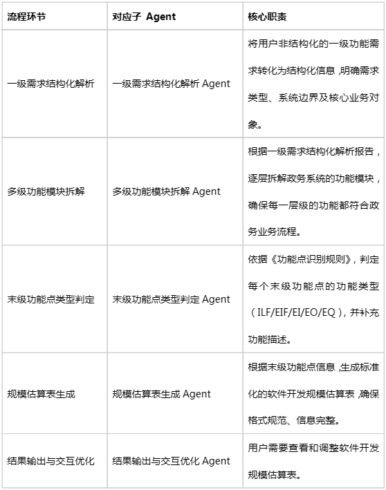 先把政务估算的全流程拆解开,再给每个环节分配对应的子智能体,避免功能重叠或遗漏。我们梳理了需求和 Agent 分工,搭建时直接对照配置: