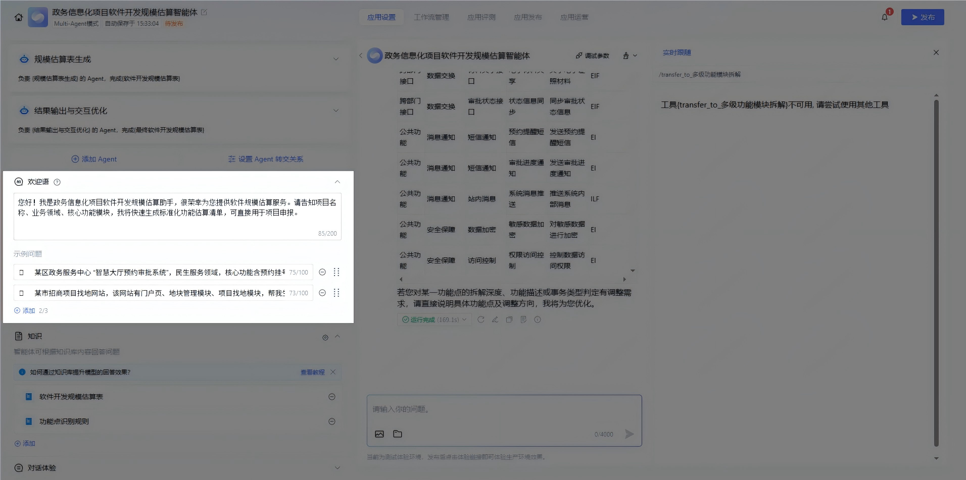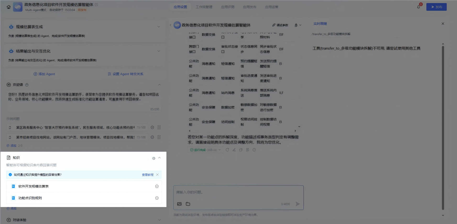 2.知识库上传政务专属内容:把功能点识别规则、常见政务项目功能拆解案例、软件开发规模估算表等,整理成 Excel 或 Word 上传到知识库,设置 “规模估算表生成 Agent” 优先调用这些内容;
