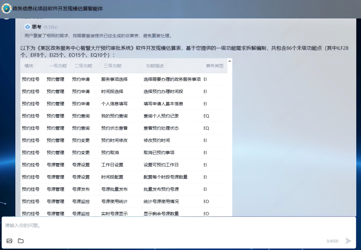 1.欢迎语直接引导需求提交:“您好!我是政务信息化项目软件开发规模估算助手,很荣幸为您提供软件规模估算服务。请告知项目名称、业务领域、核心功能模块,我将快速生成标准化功能估算清单,可直接用于项目申报。”