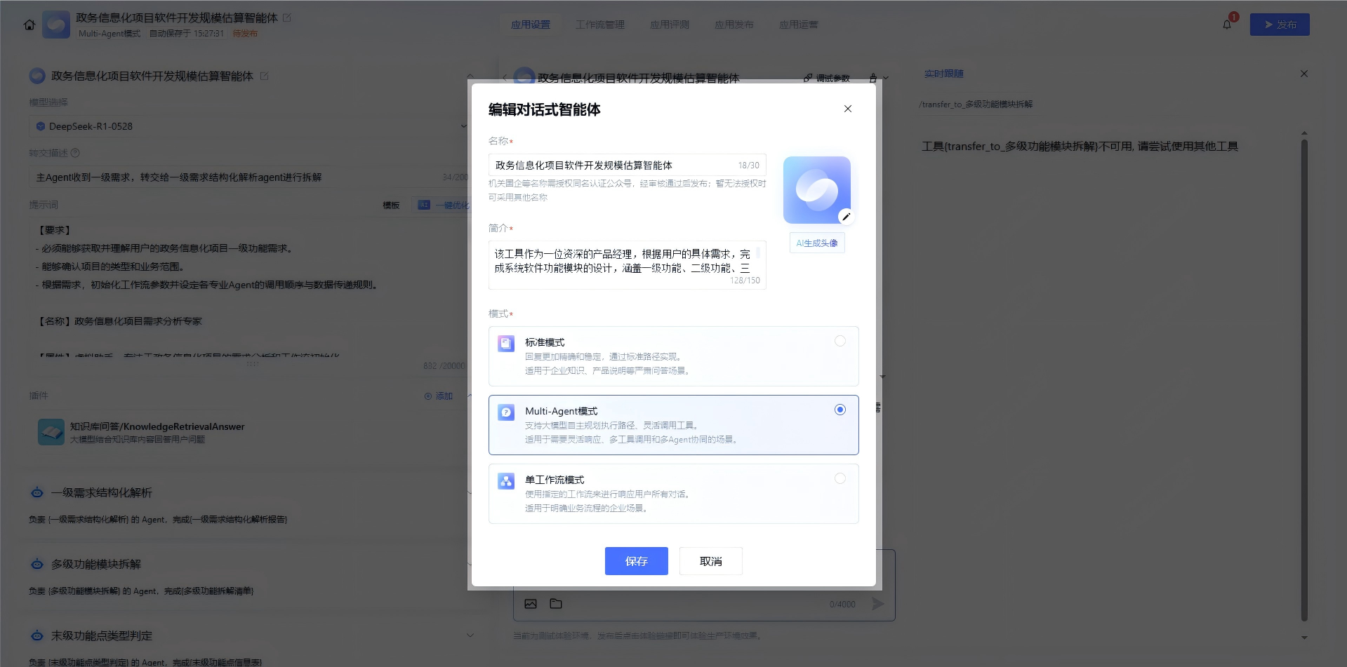 2.点击 “新建智能体”,选择“Multi-Agent 模式”,输入智能体名称“政务信息化项目软件开发规模估算助手”,简介注明 “基于用户提交一级功能需求,自动完成需求解析、多级拆解、类型判定、报表生成,适配政务项目申报场景”;