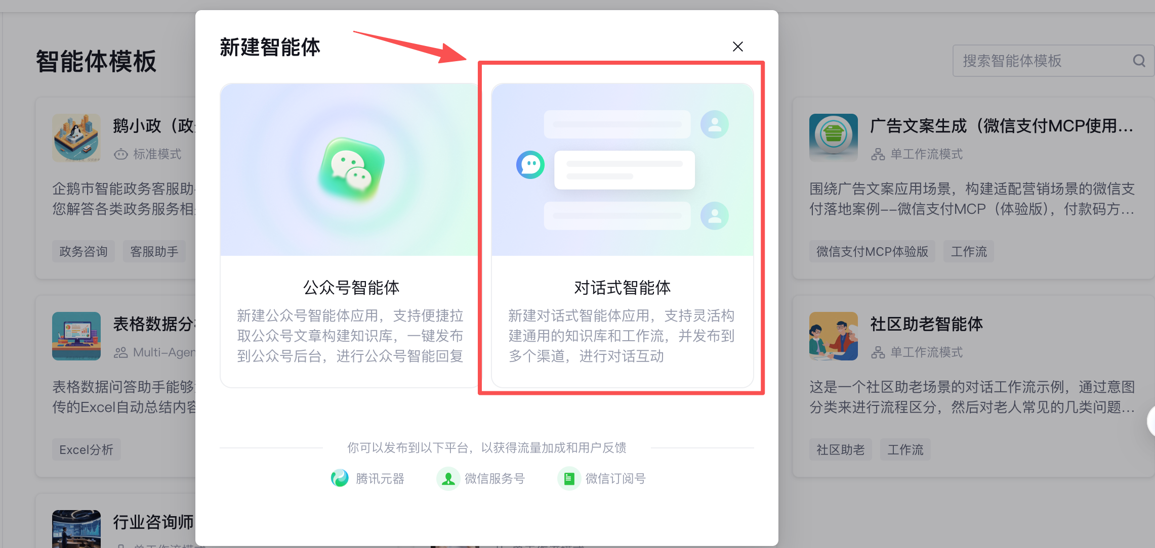 点击右上角“新建智能体” -> “对话式智能体”;
