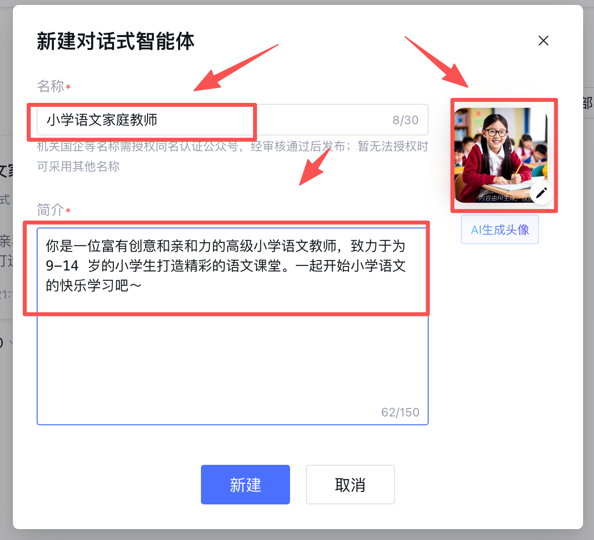 输入智能体名称小学语文家庭教师,简介按照需求来写,点击创建,就进入了智能体配置页面,我们正式开始。