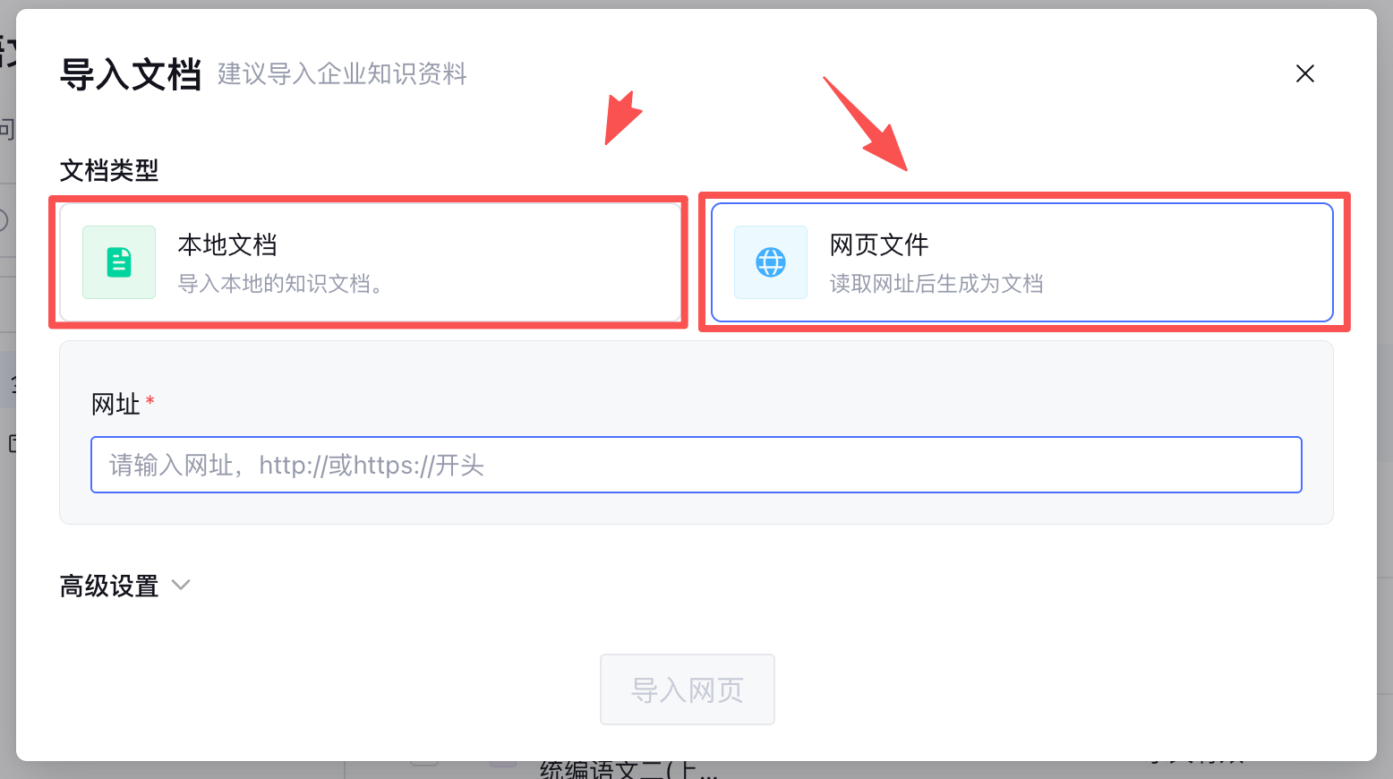 在配置页面的“知识库”模块,点击“添加”。将我们准备好的PDF、Word文件批量上传或者将找到的网页链接输入进去。