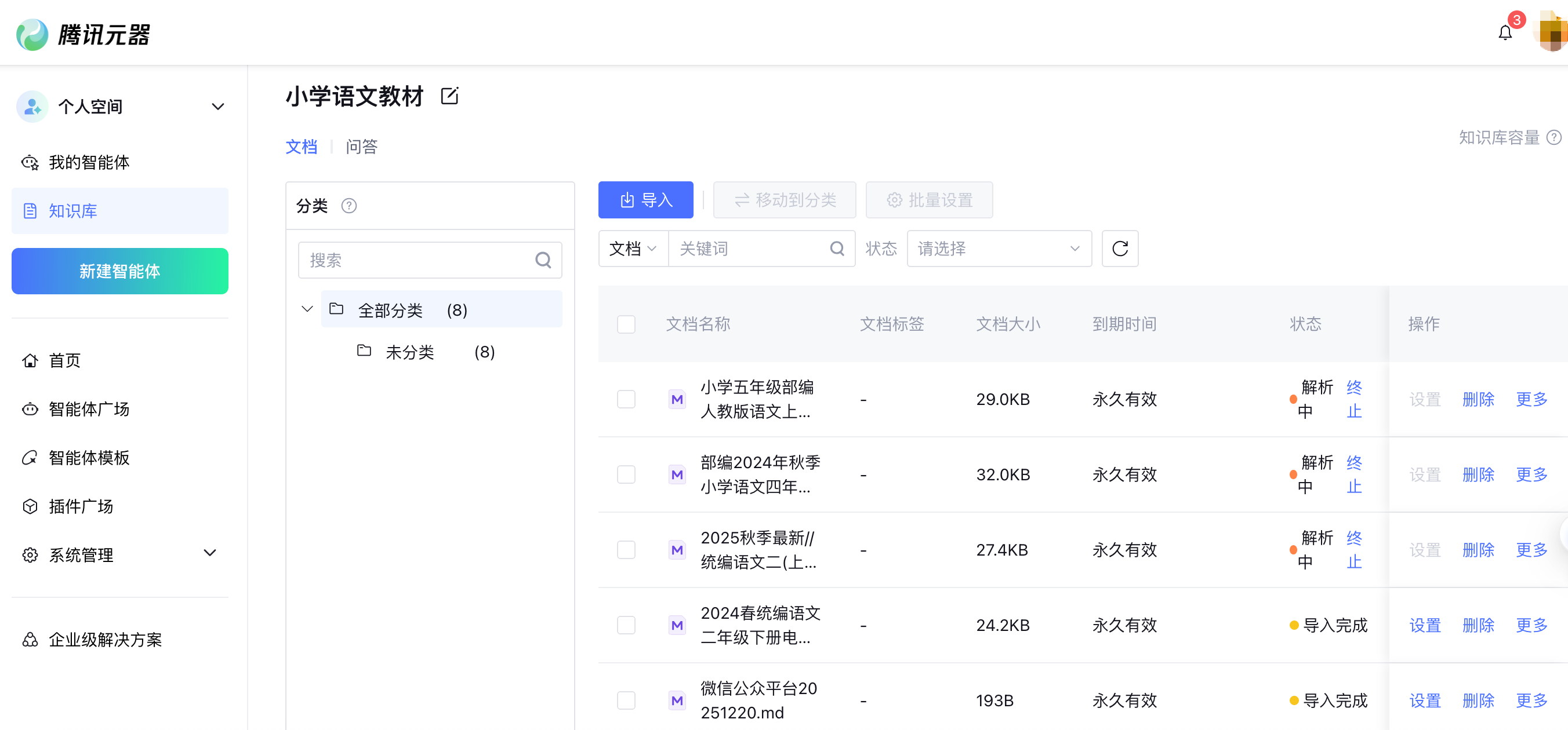 技巧: 腾讯元器会自动对文档进行分段和索引。为了提高准确率,建议在上传前将文档的文件名改得清晰一些,如部编版_小学三年级上册_语文电子课本.pdf。