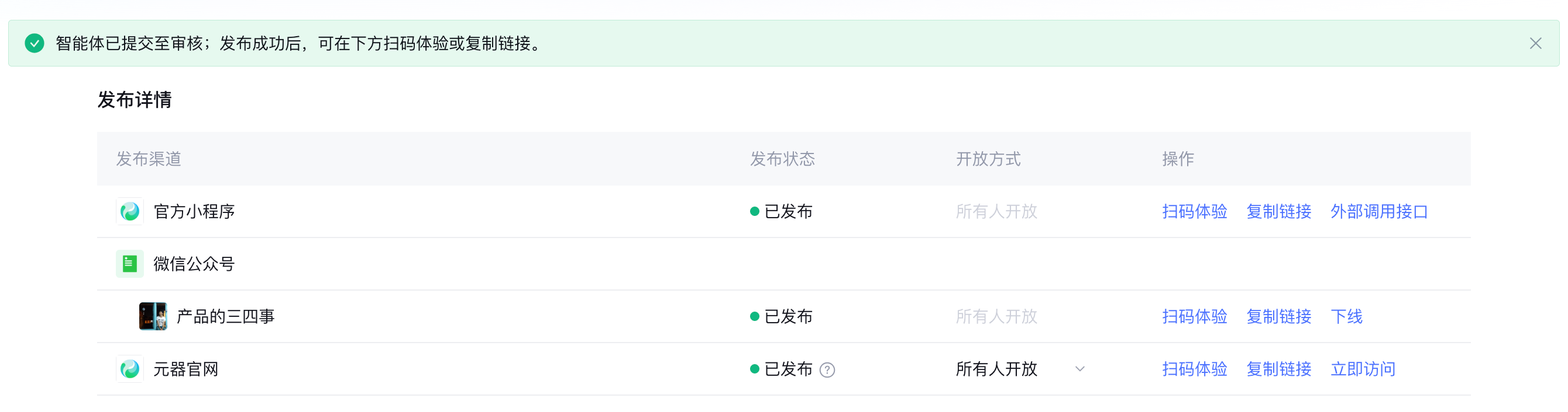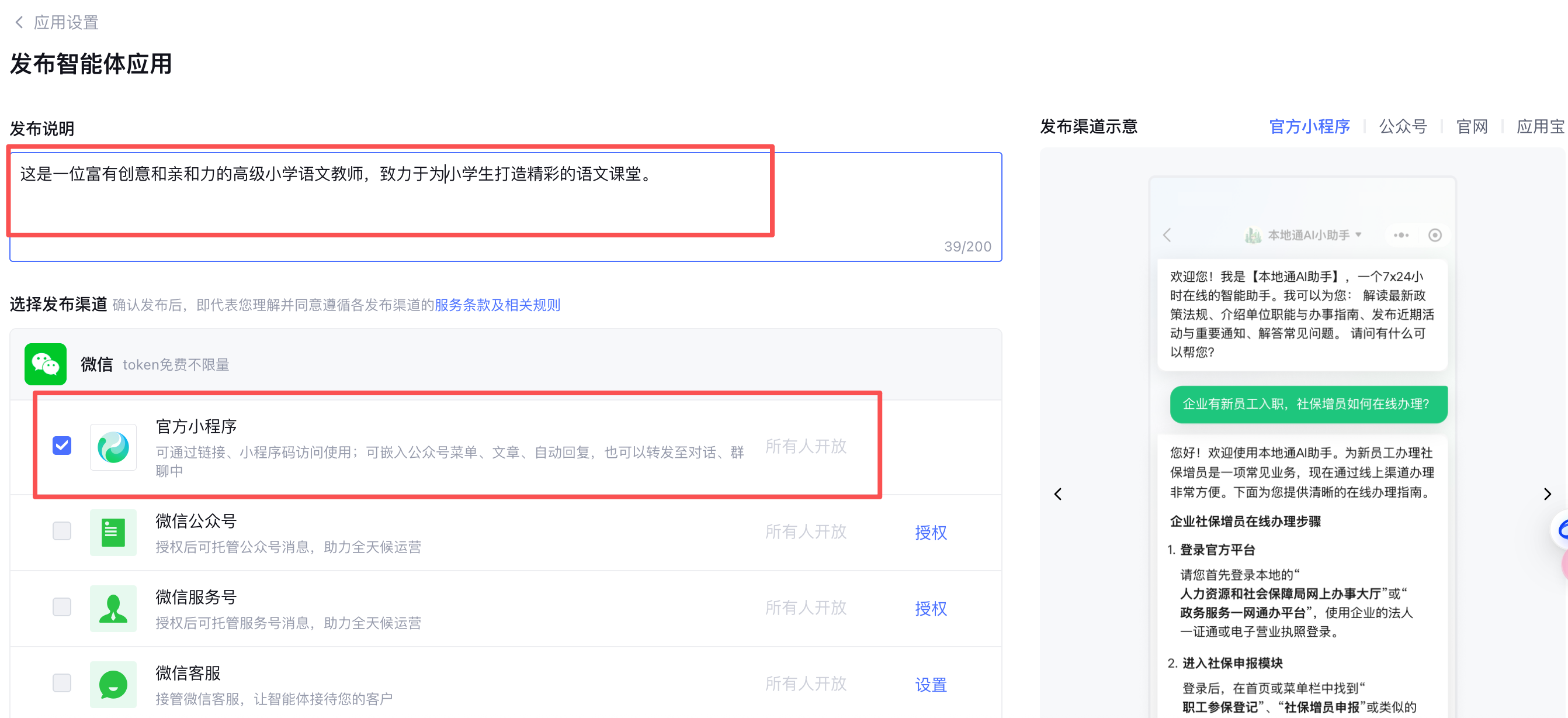 1.智能体调试满意后,点击右上角“发布”,在腾讯元器的发布设置里,支持微信等多个渠道(如官方小程序,微信公众号,微信服务号)。