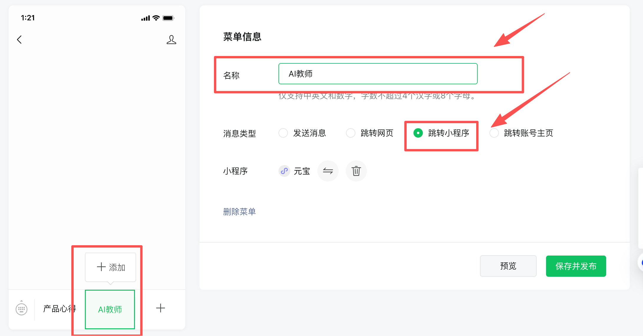 4.进入自定义菜单,菜单栏里设置一个“AI教师”的菜单,选择跳转到小程序,再选择关联小程序-元宝,根据截图配置好路径。