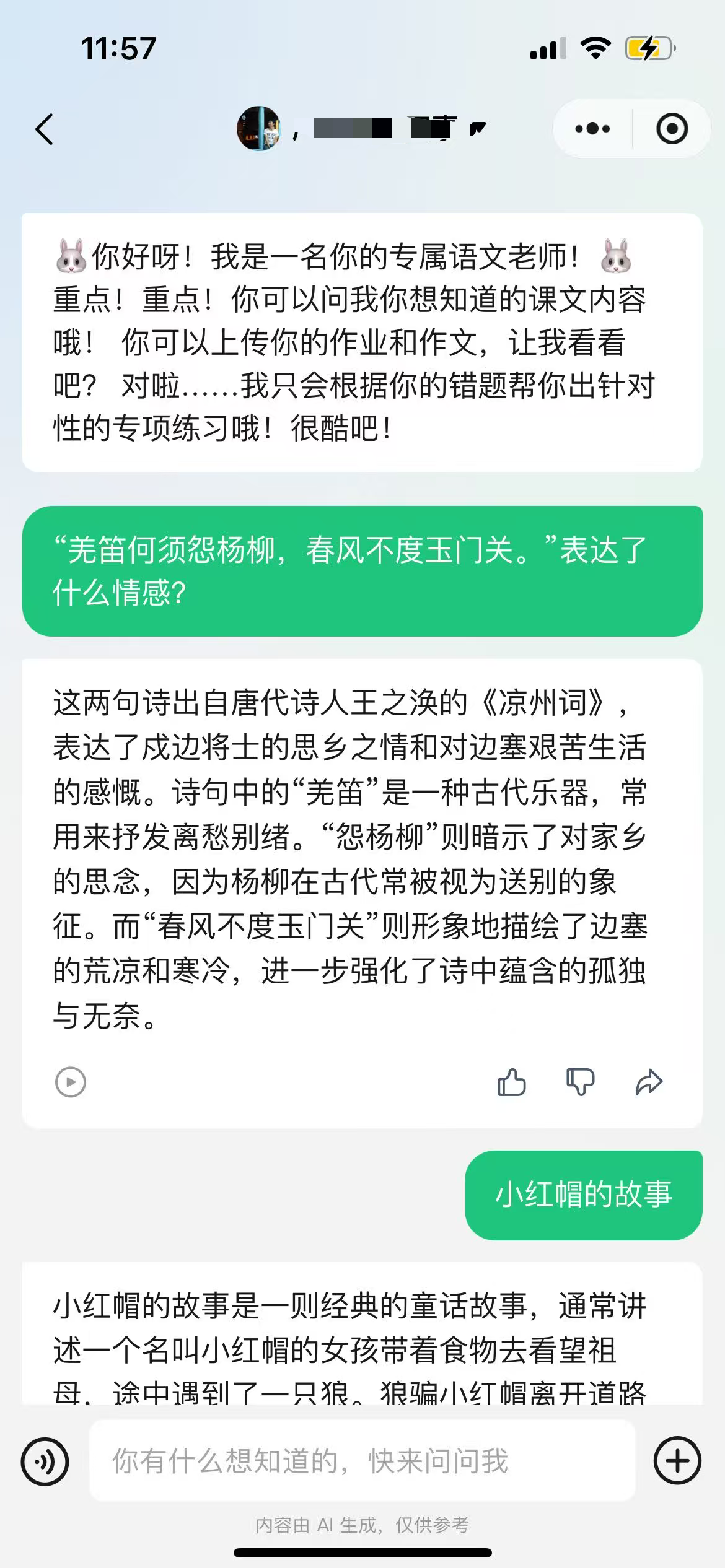 3. 随时随地的“十万个为什么” “妈妈,‘举头望明月’的‘举’是什么意思?” 以前我得翻手机查半天,还不一定对。现在孩子直接语音问AI,AI老师会结合知识库里的权威解释,不仅讲意思,还顺便把李白写这首诗的背景故事讲得绘声绘色,孩子听得津津有味。