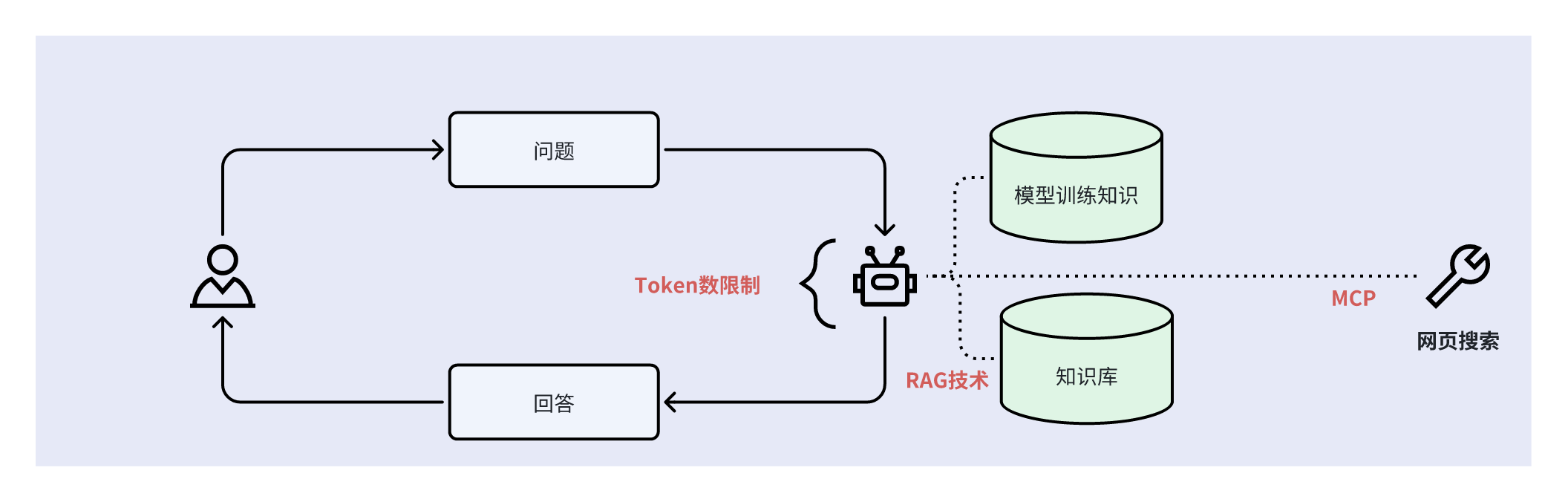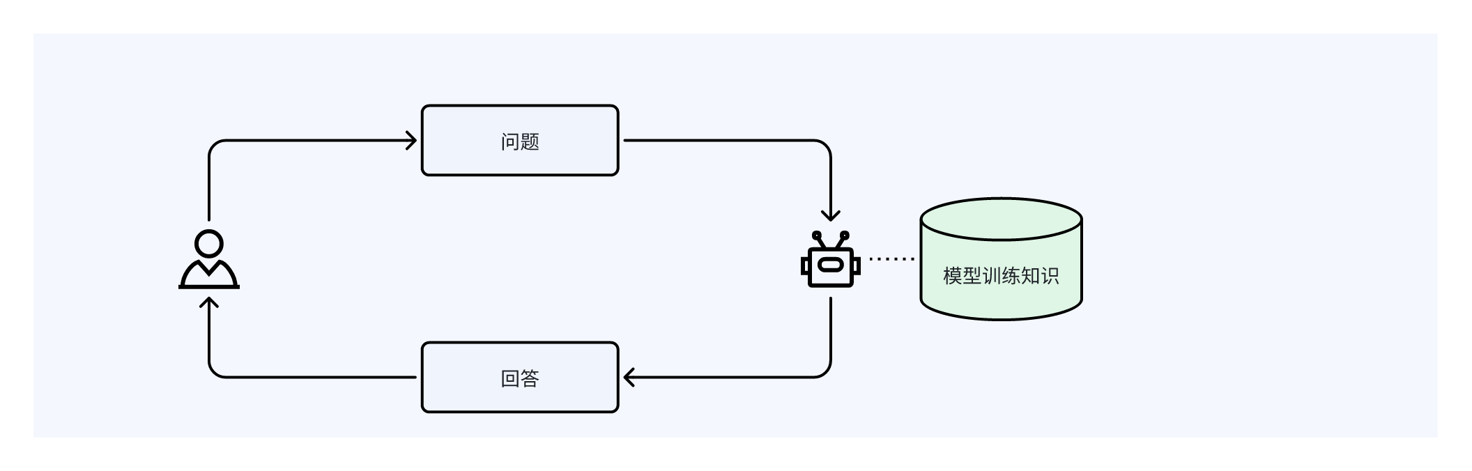 最简单的做法是把问题丢给LLM。但它只能回答训练时的数据,知识陈旧,还容易”一本正经地胡说八道”。就像一个刚毕业的学生,理论知识多,但不懂你的具体业务。