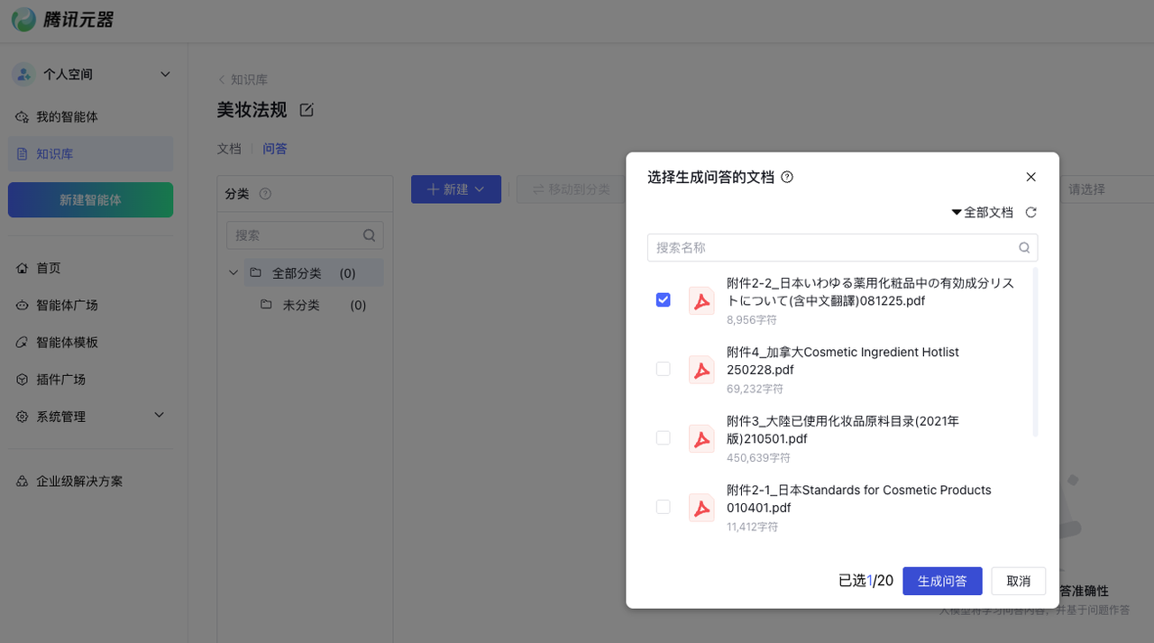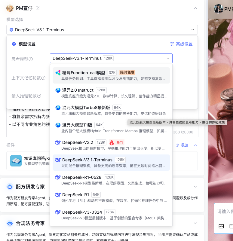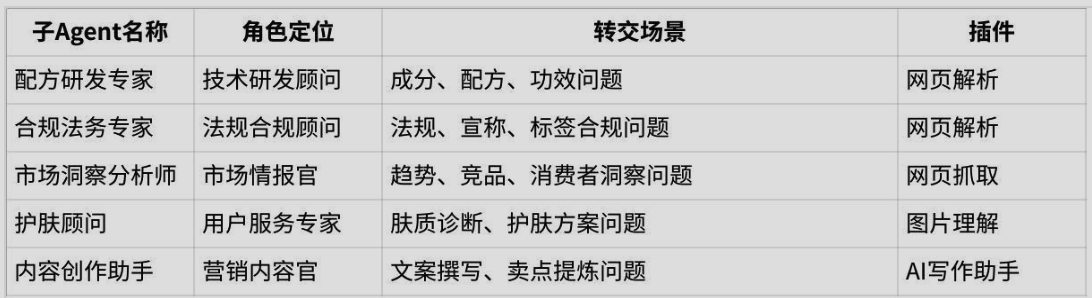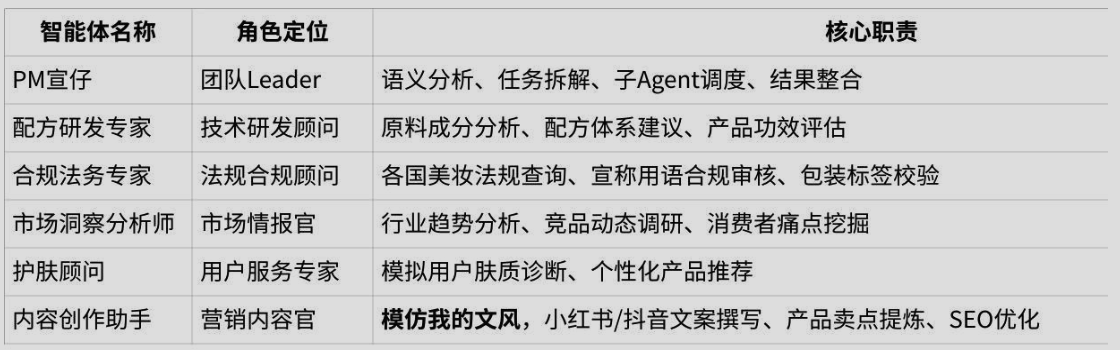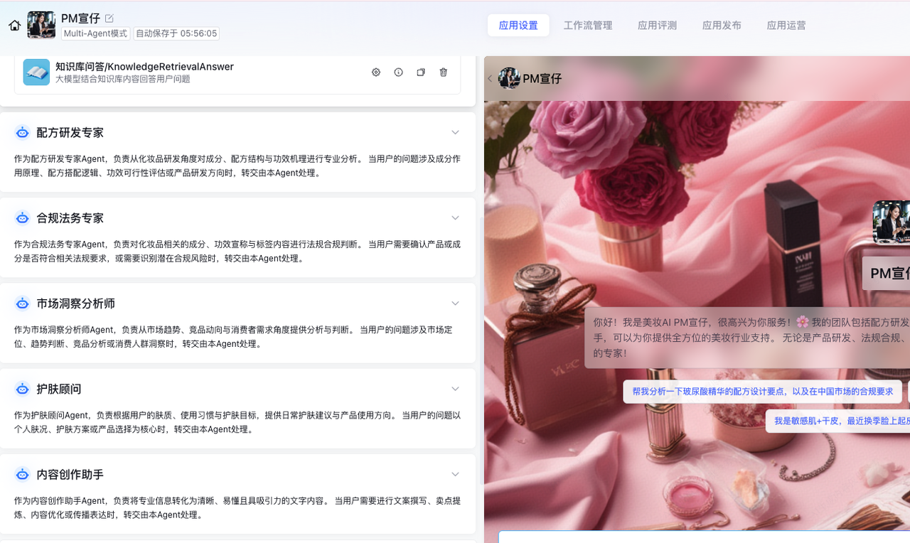 包括负责拆解需求和统筹判断的 PM Leader、专注成分与配方逻辑的研发专家、把关宣称风险的法规合规顾问,以及辅助输出内容与护肤建议的多个专业角色,全部都是我通过「腾讯元器」亲手搭建完成的智能体。