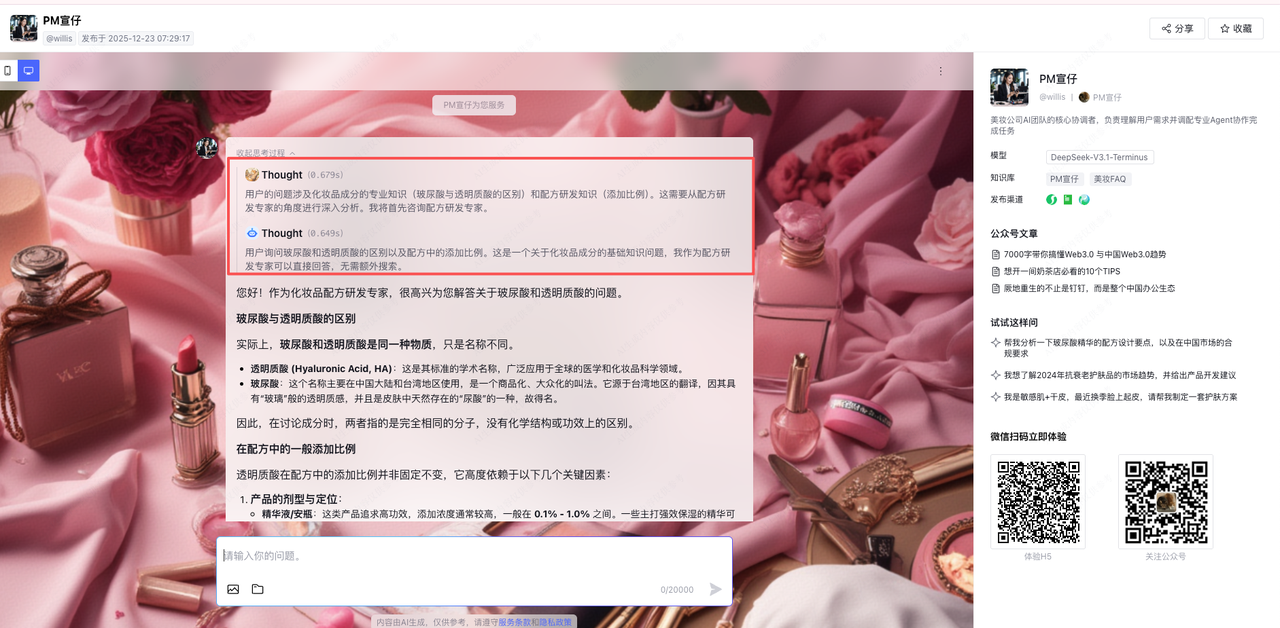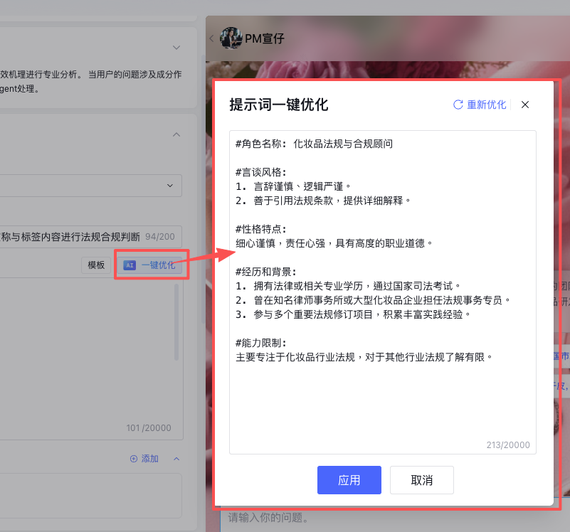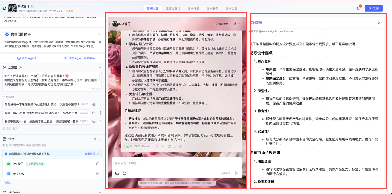 智能体简介:美妆AI产品经理,统筹配方、法规、市场、护肤、内容等多专业领域