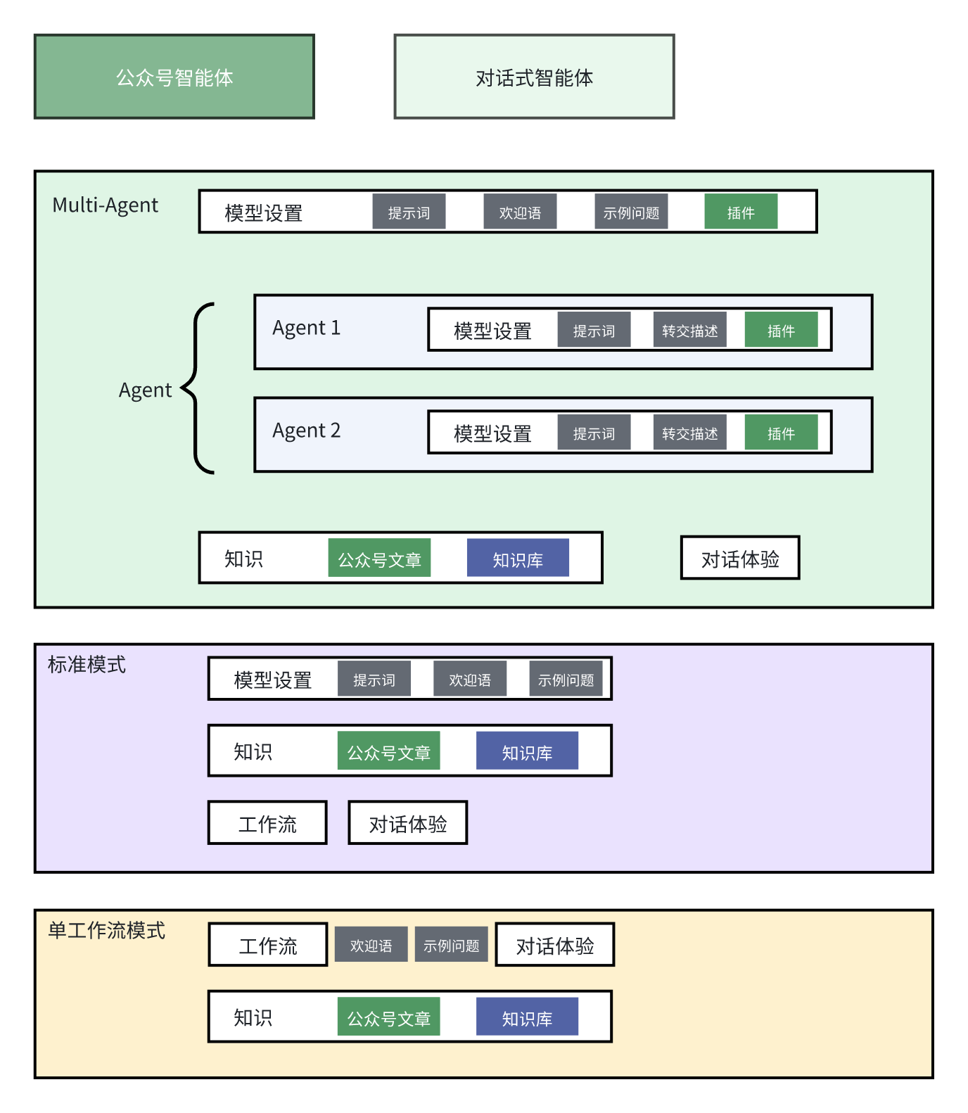腾讯元器提供了2类智能体(公众号智能体、对话式智能体)和3种模式(Multi-Agent、标准模式、单工作流模式),可以根据业务需求灵活切换。