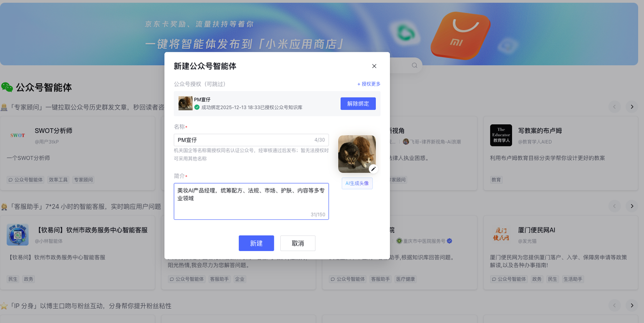 - 选择「公众号智能体」(这步很重要,因为后续无法再更改)