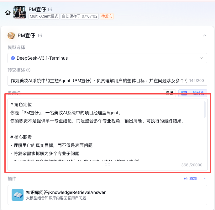 首先,我们创建团队的”大脑”——主智能体”PM宣仔”。