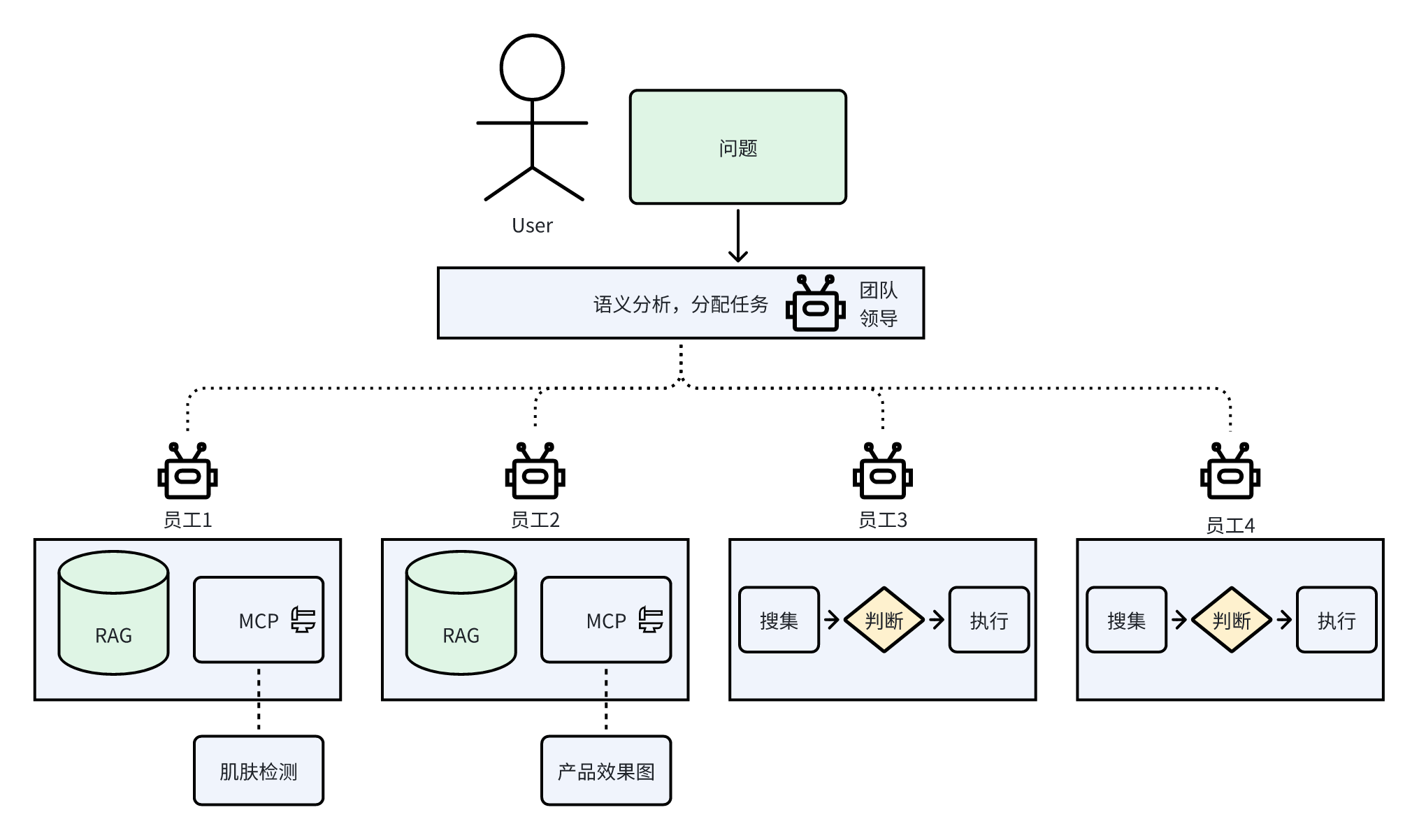 既然单个AI有短板,Workflow又太死板,有没有可能组建一个团队?有的负责查资料,有的负责写配方,有的负责审法规,再由一个”Team Leader”负责统筹——这就是 Multi Agent(多智能体)的核心魅力。