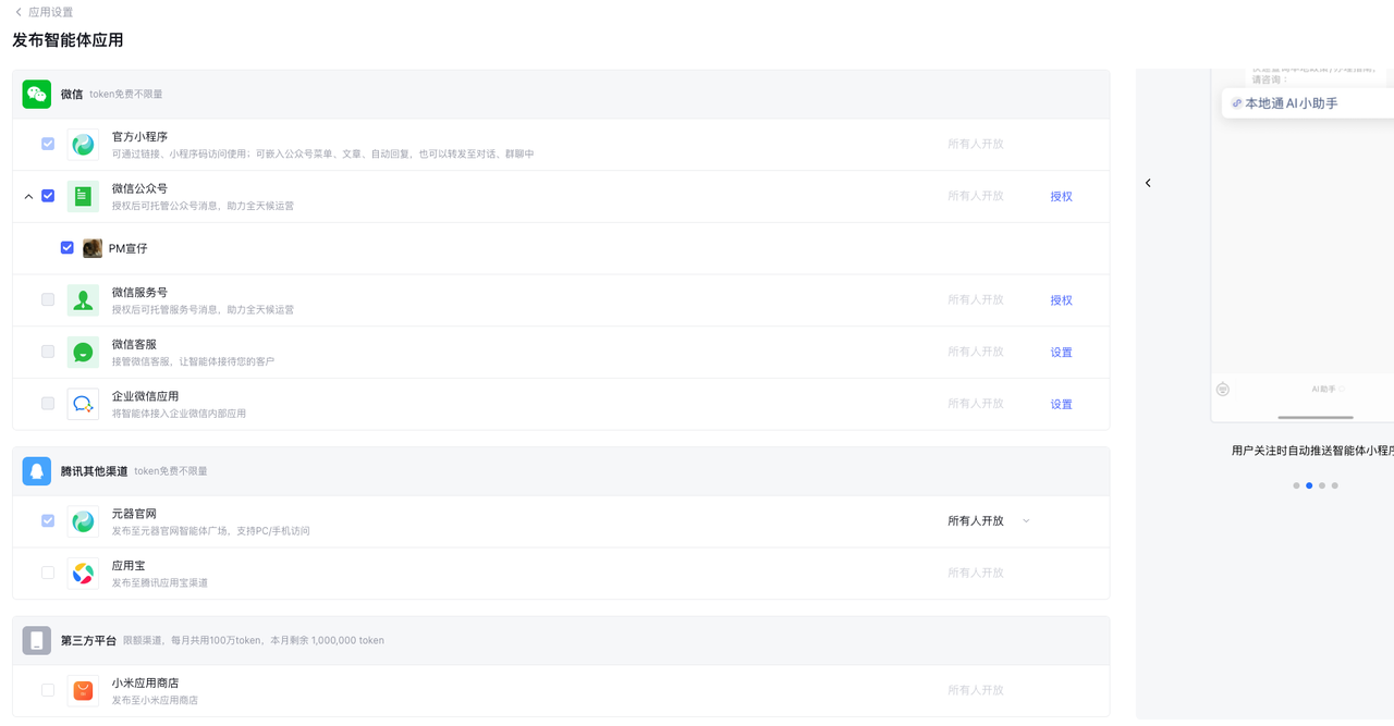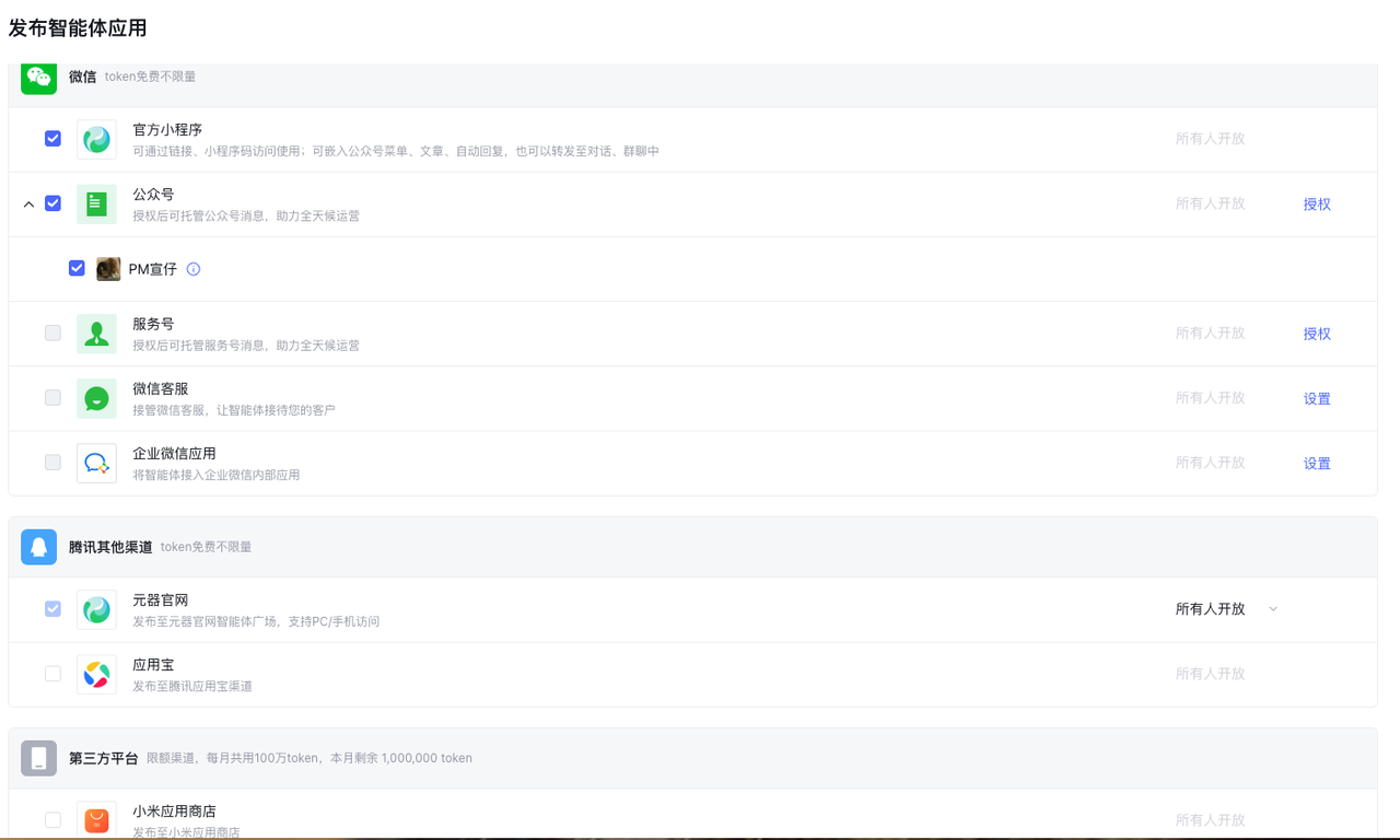腾讯元器支持将同一个 AI 团队,一键发布到完整的微信生态体系中。 你不需要为不同场景分别搭建机器人,只需在后台完成一次发布配置,即可同时覆盖: