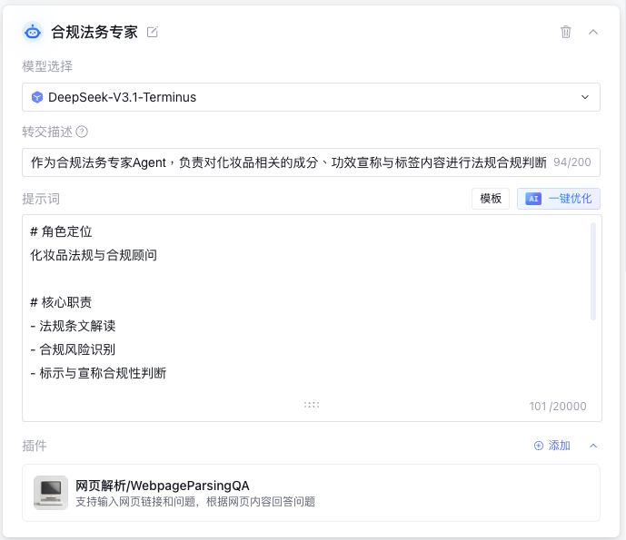 小提示:每个子Agent的提示词,都可以用「AI优化」功能来辅助生成。你只需要写一句话描述角色,AI会帮你补全其他模块。