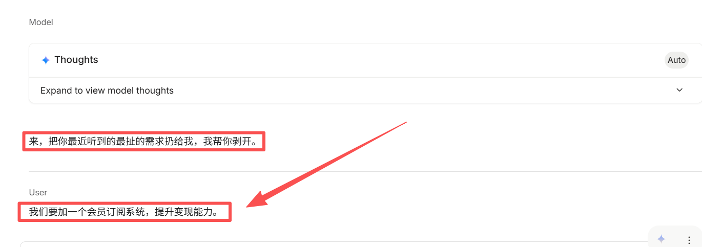 2.启动对话:直接发送一条消息,模型会自动输出启动语:“来,把你最近听到的最扯的需求扔给我,我帮你剥开。”