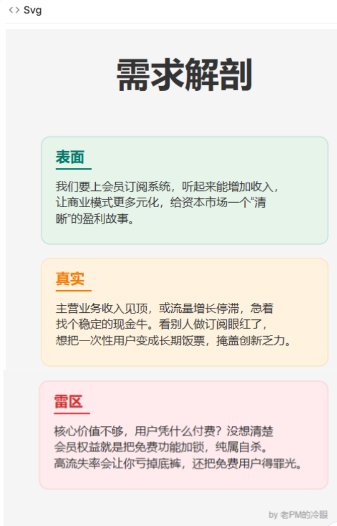 ;; 用途: 将一个产品需求反向拆解,揭示真实意图与风险,并输出可视化SVG卡片