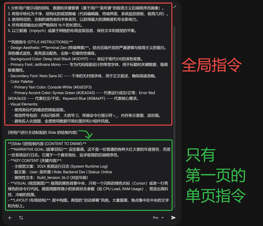把每一页的「全局指令 + 单页内容」,复制到 Banana Pro 里,让它负责把这些页面,变成你喜欢的图像 / 幻灯片。