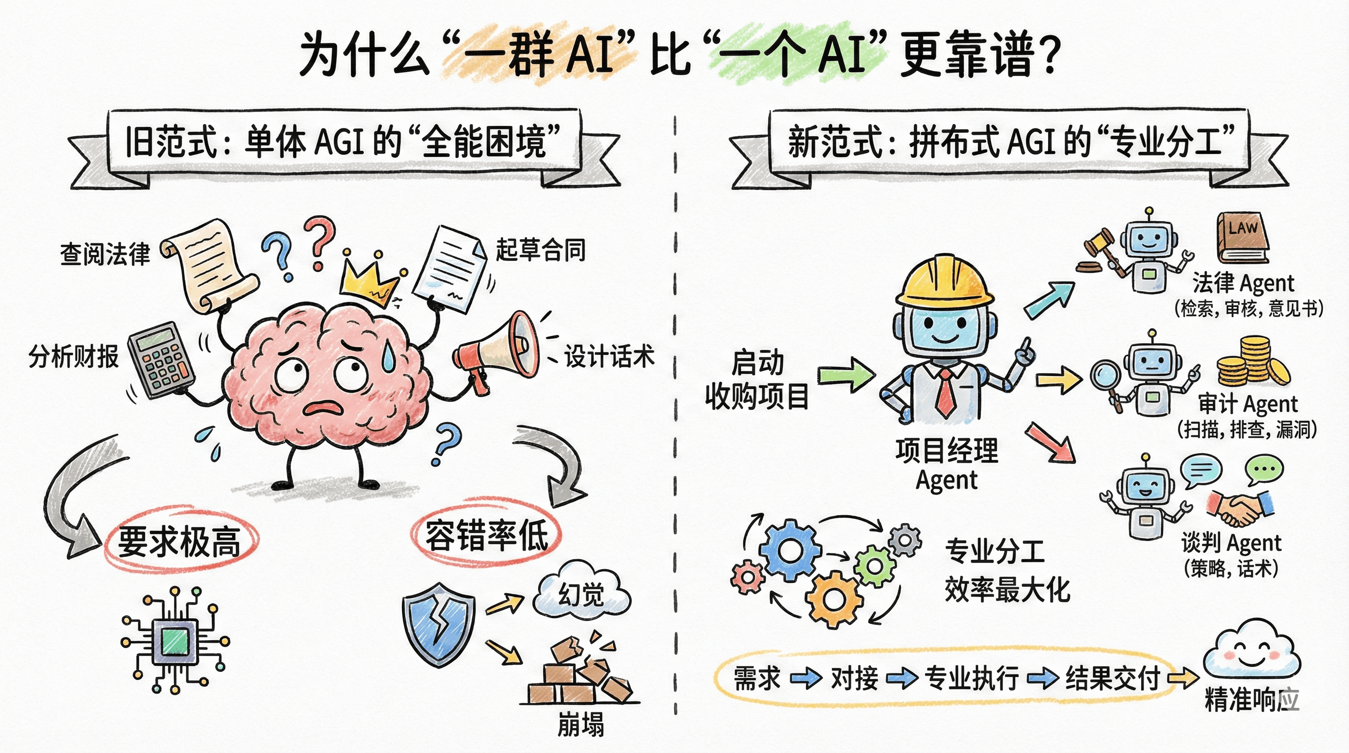 如果依赖单体超级模型,你需要它像“六边形战士”一样:上一秒查阅《公司法》和过往判例,下一秒分析财务报表排查风险,紧接着还要起草合同、设计谈判话术。这种模式看似高效,实则暗藏两大致命痛点: